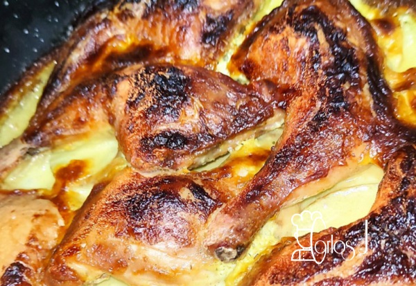 Una vez acabado servimos cada muslo de pollo acompañado de la guarnición de patatas que teníamos debajo del pollo.