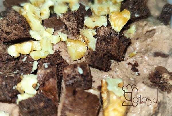 Ponga en el vaso la mitad del brownie en trozos y añada la leche condensada. Triture 20 seg/vel 5. Vierta en el bol con la nata y mezcle con movimientos envolventes.