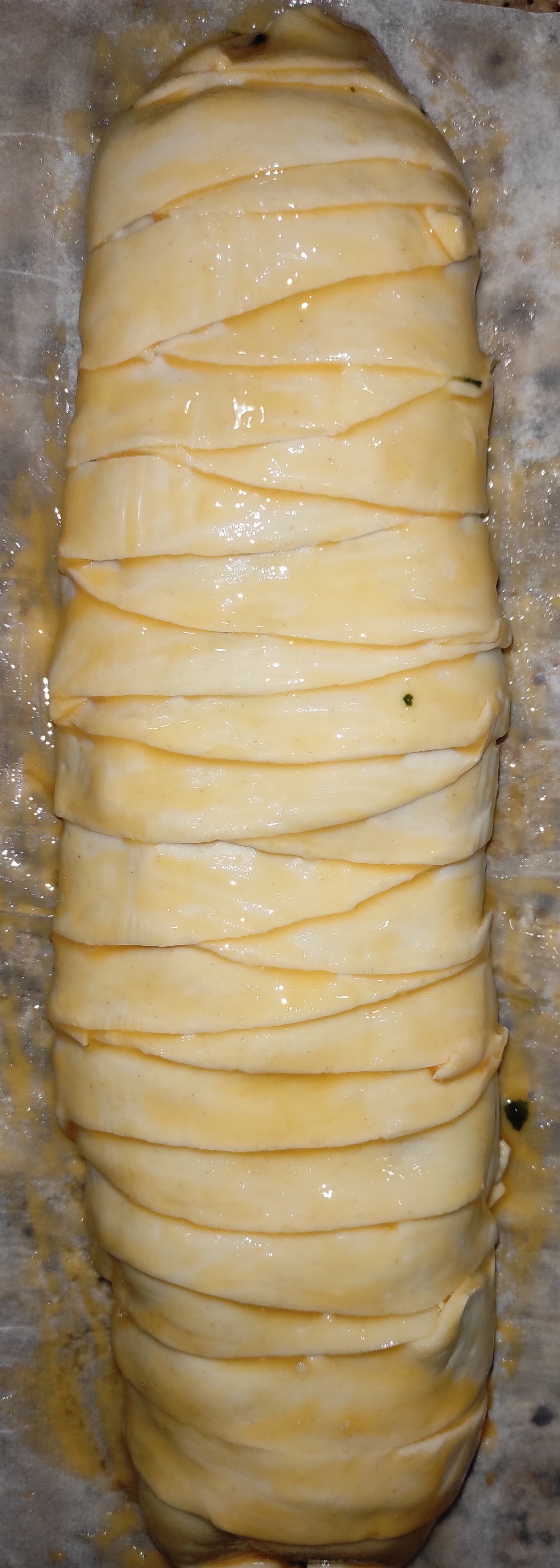 -Si es de su agrado y tiene mejor destreza con las manualidades, corte tiras de masa a cada lado del relleno y dobla los extremos juntos y cruza las tiras de masa entre sí para formar una trenza.