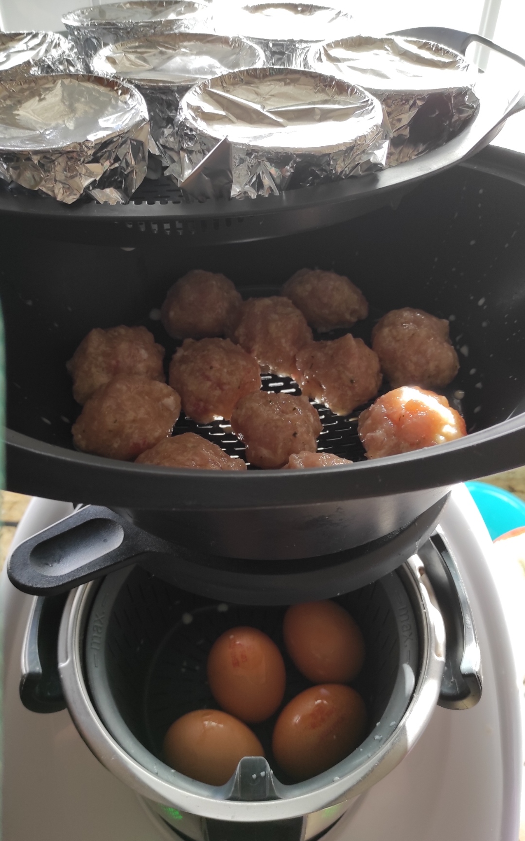FLAN DE HUEVO,ALBONDIGAS DE POLLO Y HUEVOS PARA COCER 3 EN 1 CON THERMOMIX EN RIBERA DEL FRESNO