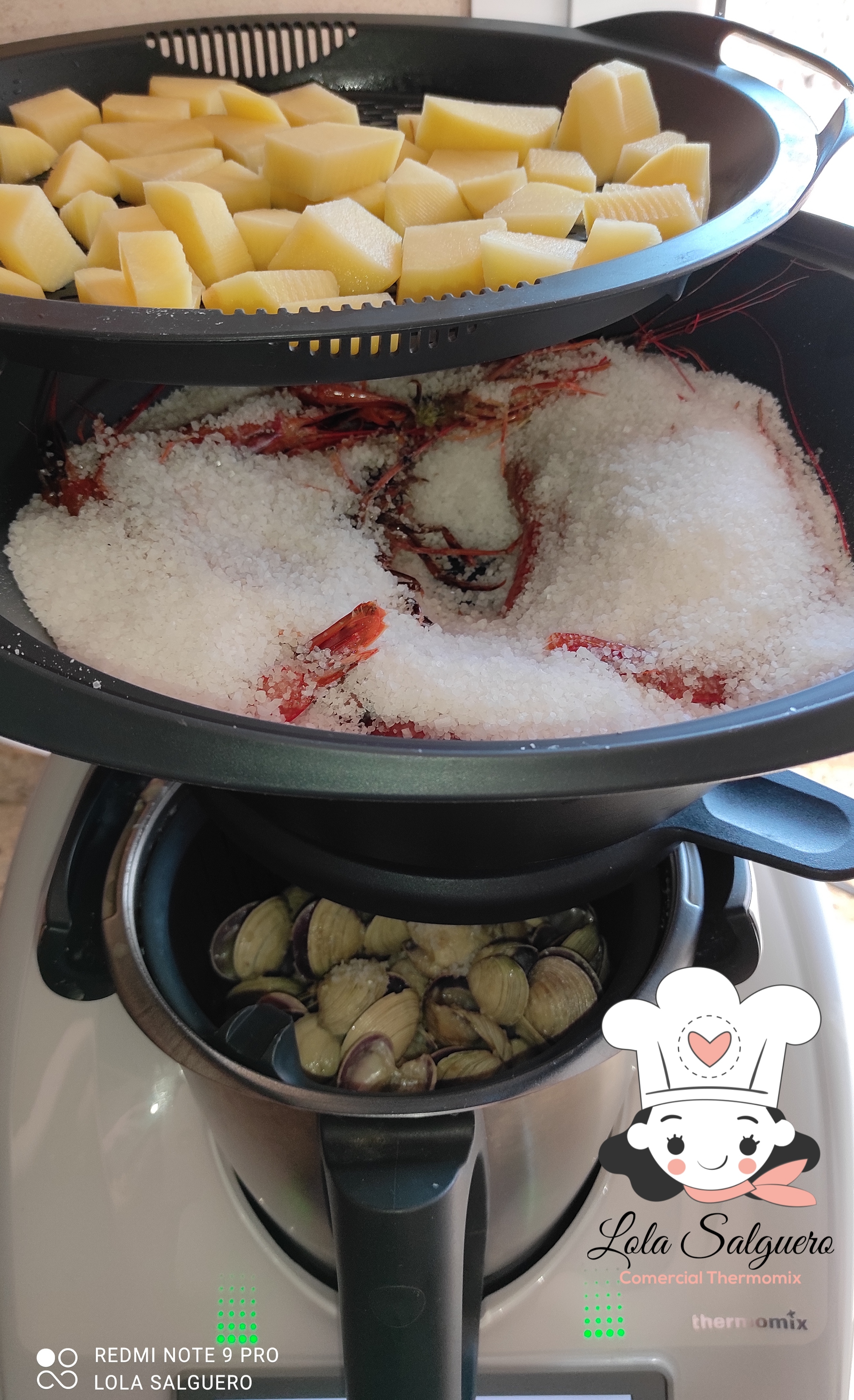- Pon en el Varoma los Gambones cubierto de sal gorda,dejando un hueco en el medio del varoma libre para q suba el vapor.