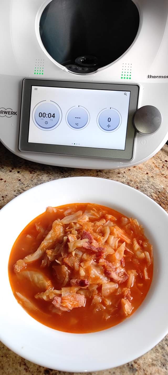 -Despues añadimos el repollo , el agua y salpimentamos, ponemos el tomate triturado y programamos 20 minutos / 120º / giro inverso / velocidad cuchara.