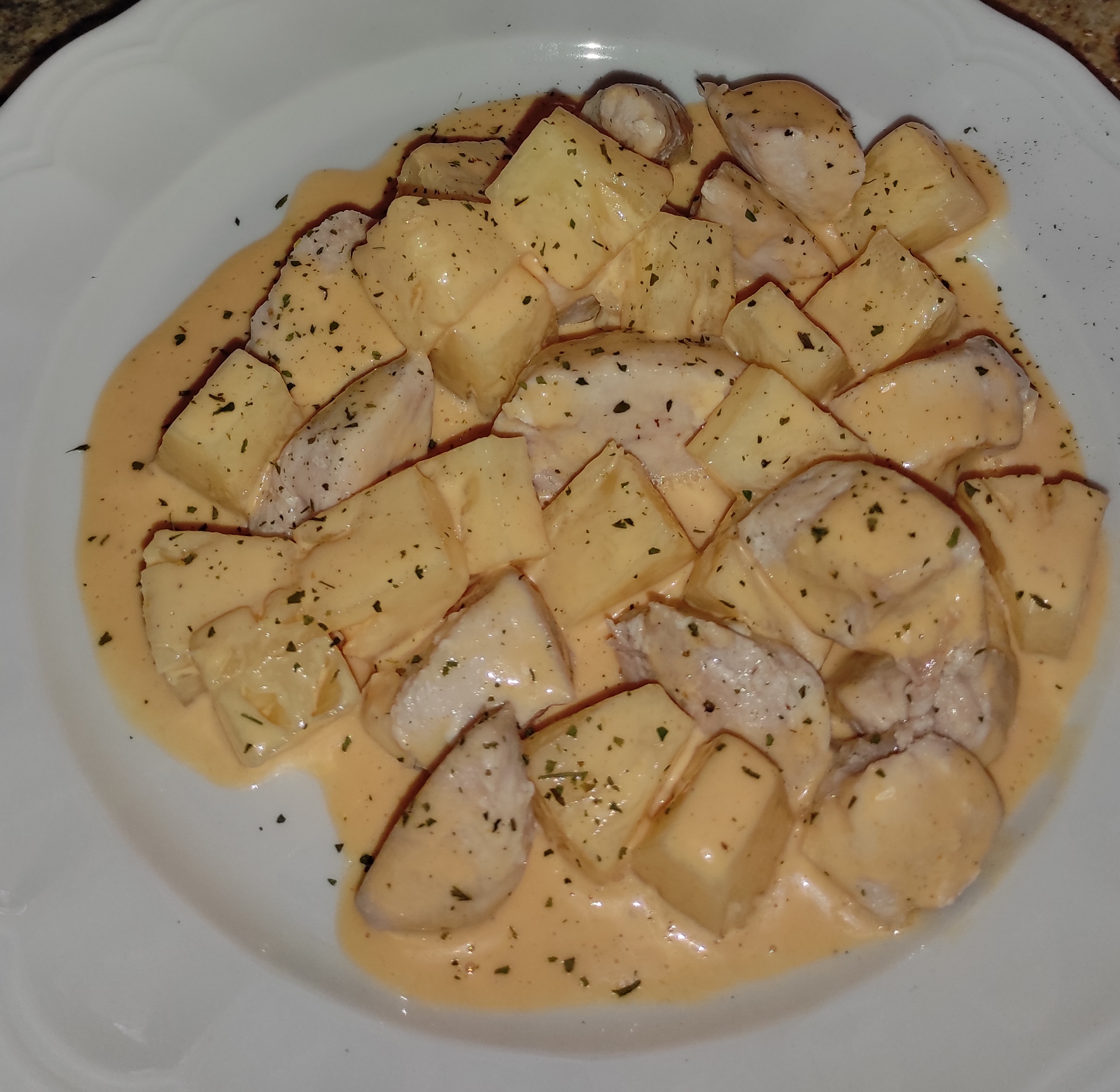 -Si la piña es de bote o enlatada, mezcle un poco de salsa cocktail con almíbar de piña y luego vierta sobre el pollo y la piña.
