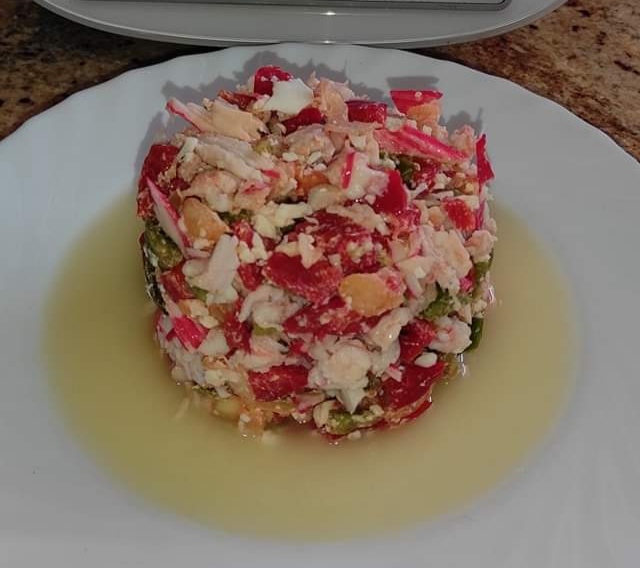 -Ponemos los ingredientes restantes y trituramos 5 segundos/ velocidad 4, incorporamos al bol con los langostinos y las baritas de surimi y removemos.