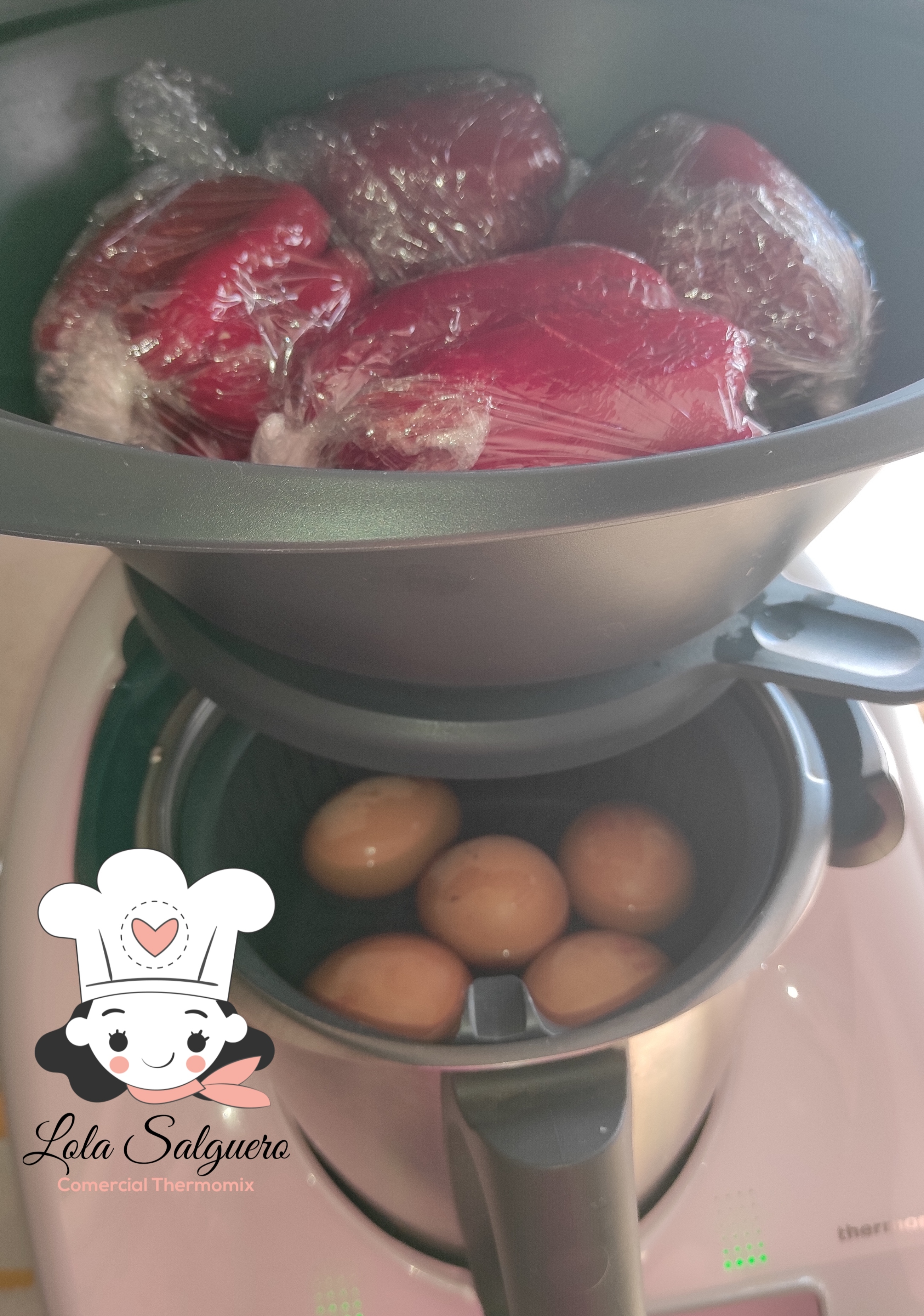 -Volvemos a colocar la tapa y programamos 30 min/Varoma/vel 2. Dejamos que los pimientos se entibien antes de retirarles el film transparente y entonces ya estarán listos para utilizar,y los huevos preparados para su utilización.