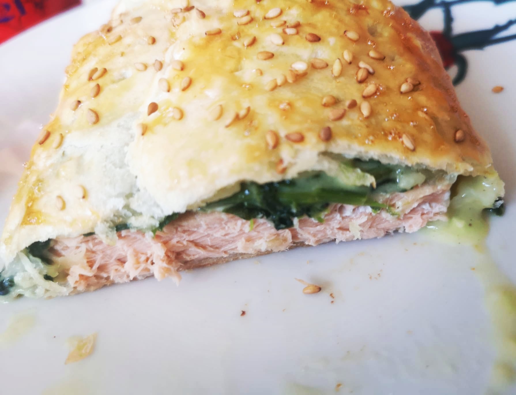 5. Cortar la masa de hojaldre a una medida que nos permita cerrarla completamente. Colocar un trozo de salmón en cada hojaldre y cubrir con la crema de espinacas. Envolver el hojaldre y pintar con huevo batido. Decoramos por encima con un poco de ajonjolí.