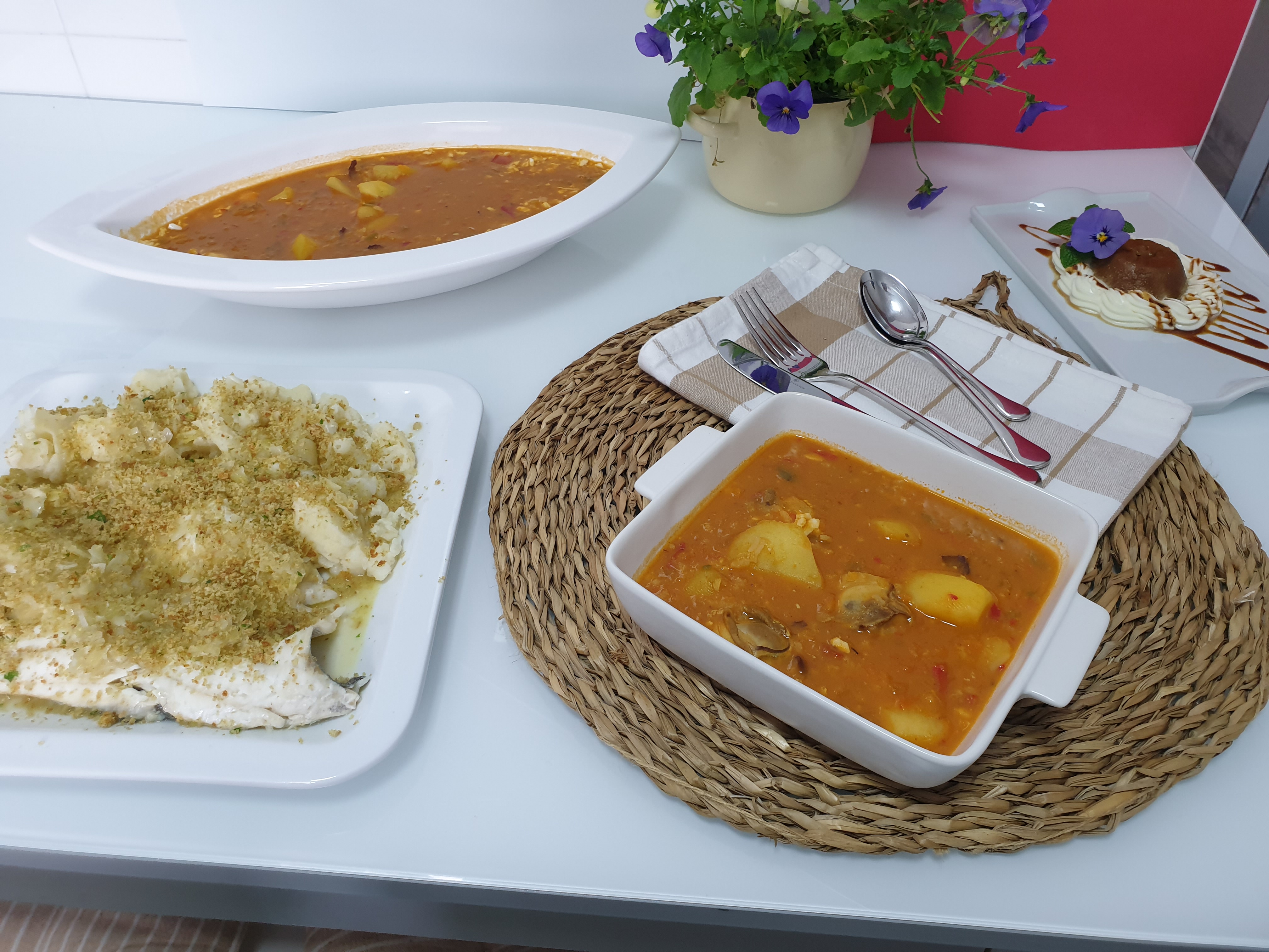 MENÚ COMPLETO: PATATAS CON CALAMARES, LUBINA CON COLIFLOR Y FLAN DE CAFÉ