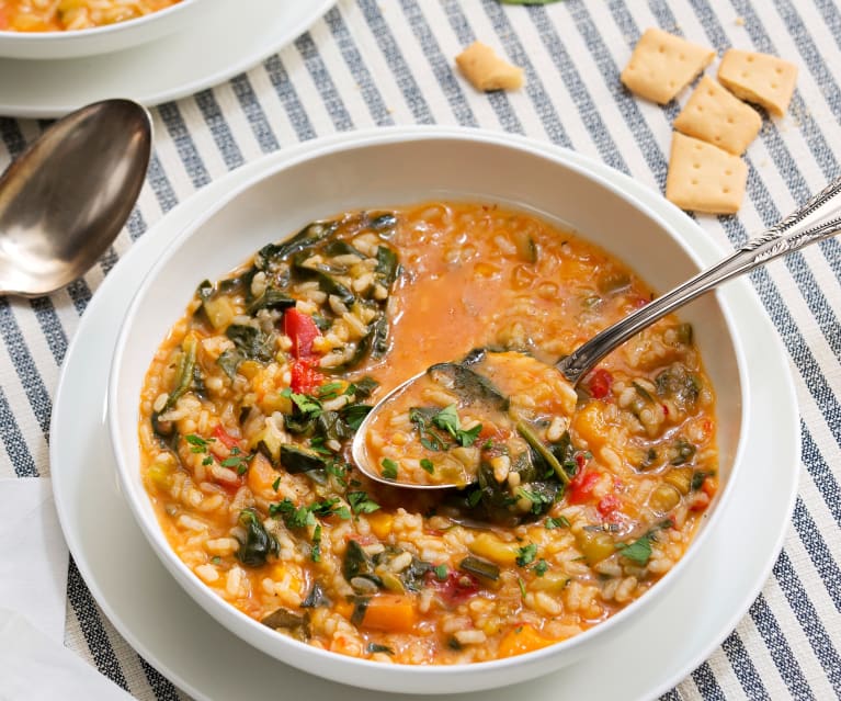 Añada el arroz y las espinacas y programe 13 min/100°C/giro inverso/vel 1. Vierta en una sopera y deje reposar durante 3 minutos. Sirva espolvoreado con perejil picado.
