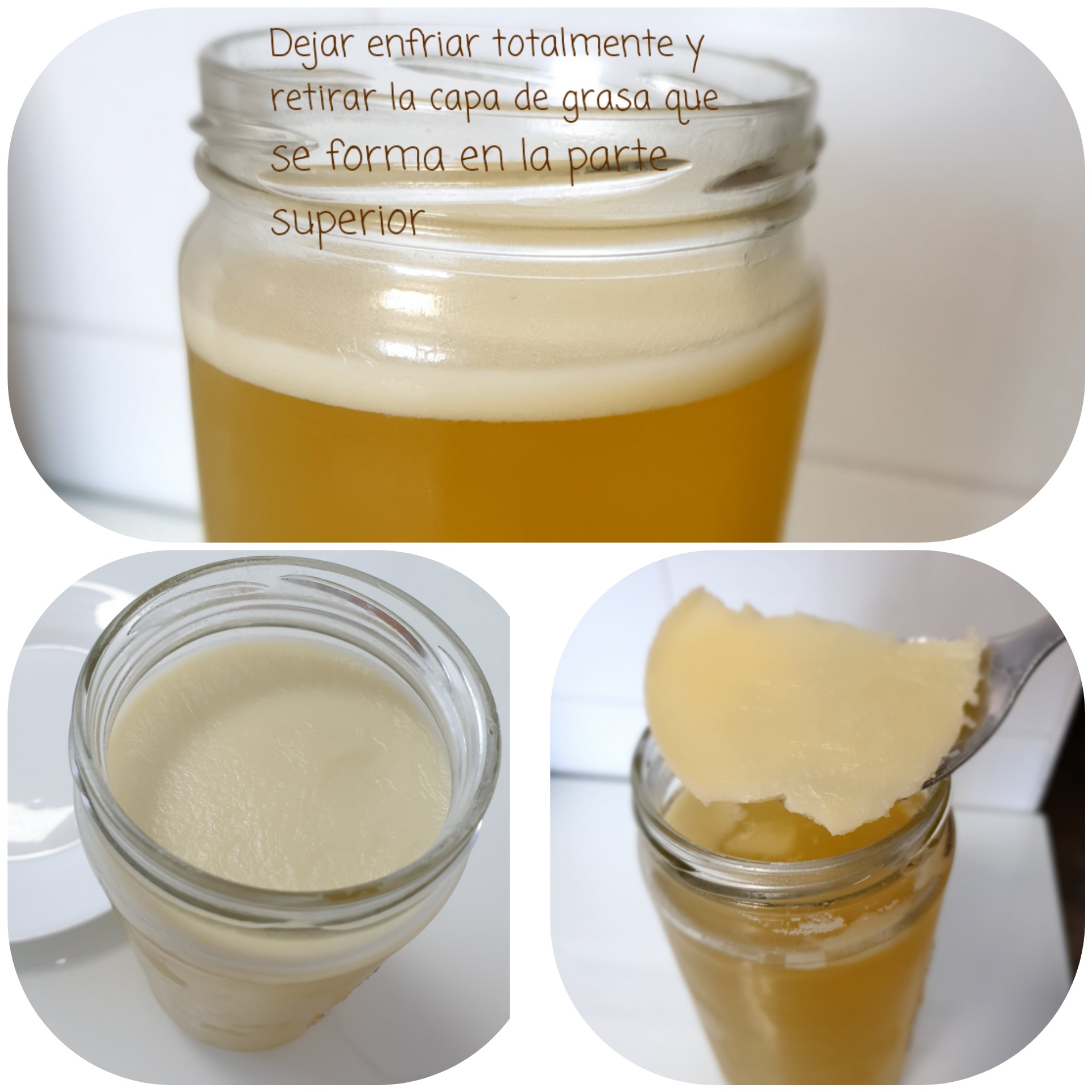 Dejamos enfriar y cuando la capa de grasa se quede arriba la quitamos con cuidado de quitarlo todo. Ya tenemos nuestro caldo de pollo desgrasado listo para tomar. Está muy rico y para los momentos de debilidad nos puede servir de mucho.