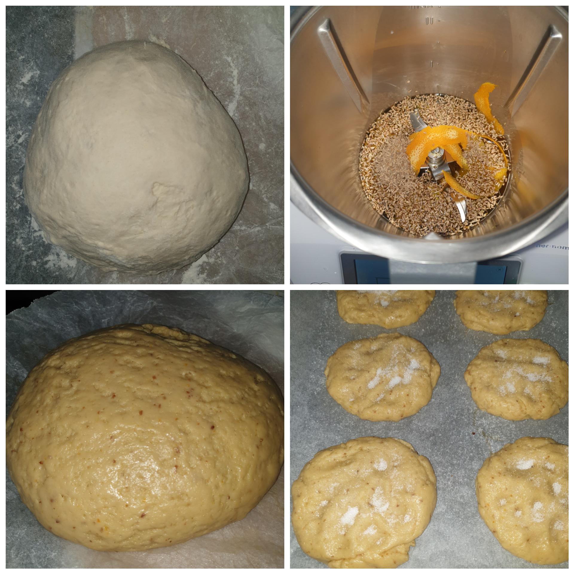 Añadimos al vaso el huevo, la manteca, el azúcar, el zumo, el licor de anís, la masa del pan reservada y programamos 30 seg/vel 6 para mezclarlo todo. Seguidamente echamos la mitad de la harina con la levadura y amasamos 1 min/ Vel espiga. Ponemos la otra mitad de la harina y amasamos de nuevo 3 min/ vel espiga.