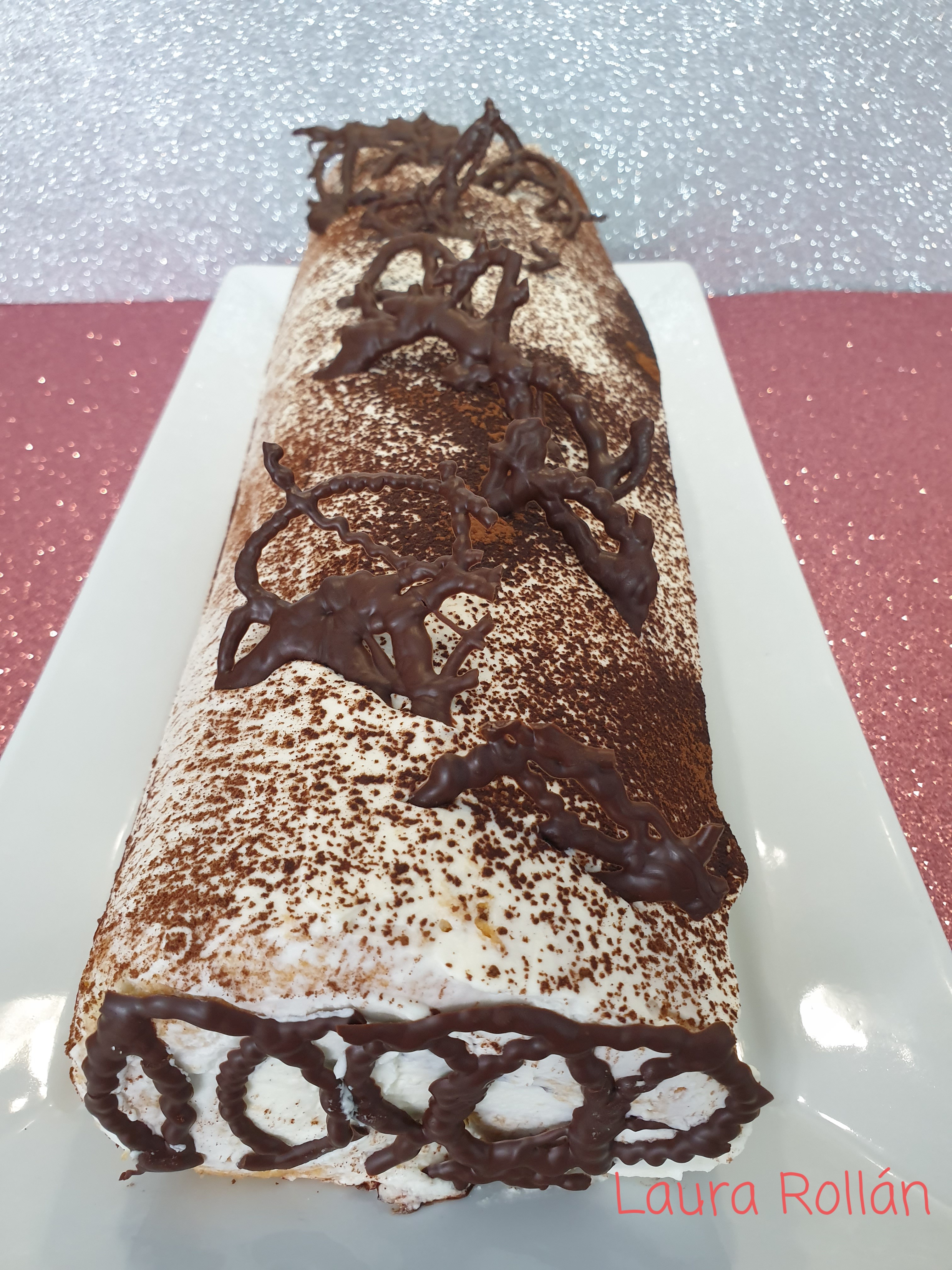 Cubrimos el rollo por fuera con la nata restante y alisamos para que quede totalmente cubierto y espolvoreamos con el cacao puro en polvo.