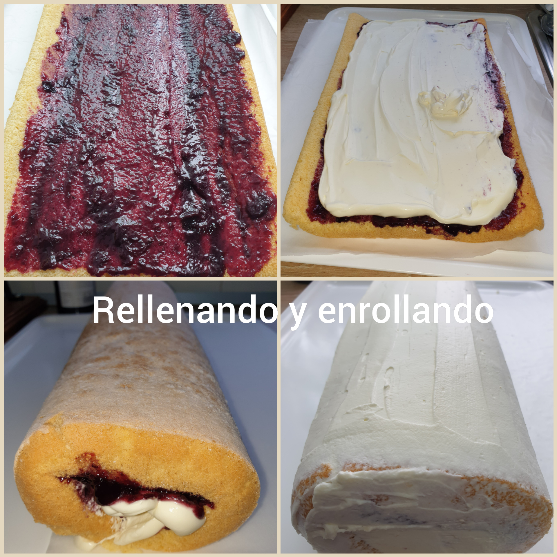 Con del bizcocho ya frío, lo desenrollamos y le ponemos la mermelada por todo el bizcocho. A continuación le ponemos la mitad de la nata que hemos montado y la extendemos por todo el bizcocho. Con cuidado, vamos enrollando sobre sí mismo.