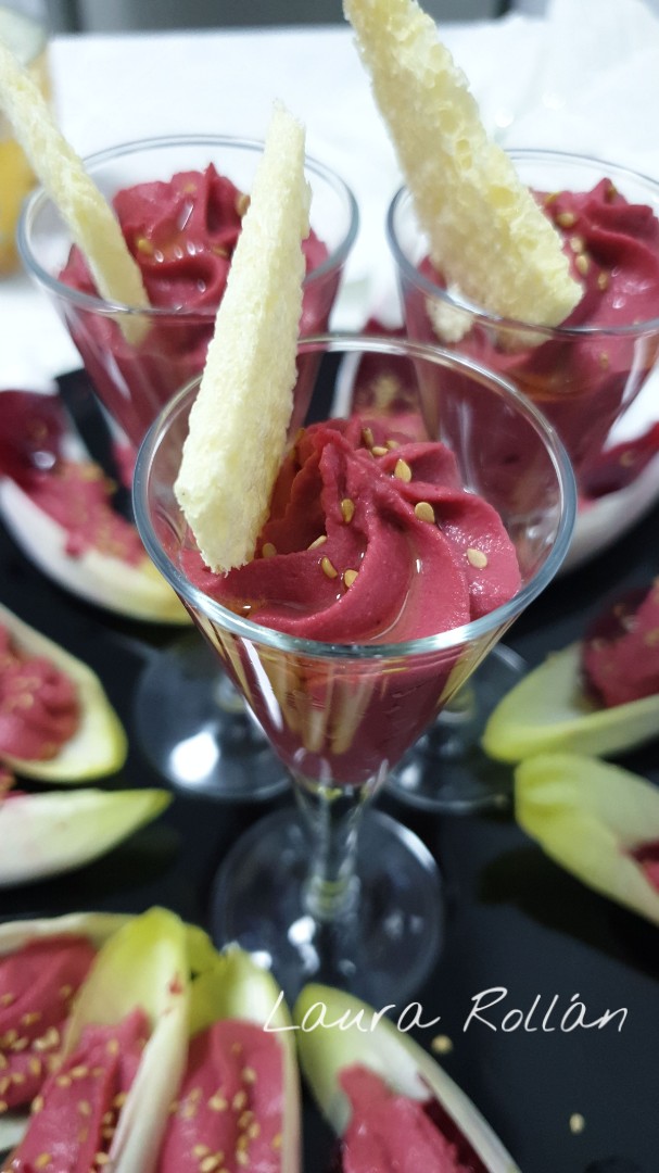 Ponga en cada hoja de endibia 1 lámina de remolacha, 1 cucharada de hummus y otra lámina de remolacha enrollada como un cono. Riegue con el aceite y espolvoree con la pimienta y el sésamo tostado. Sirva inmediatamente.