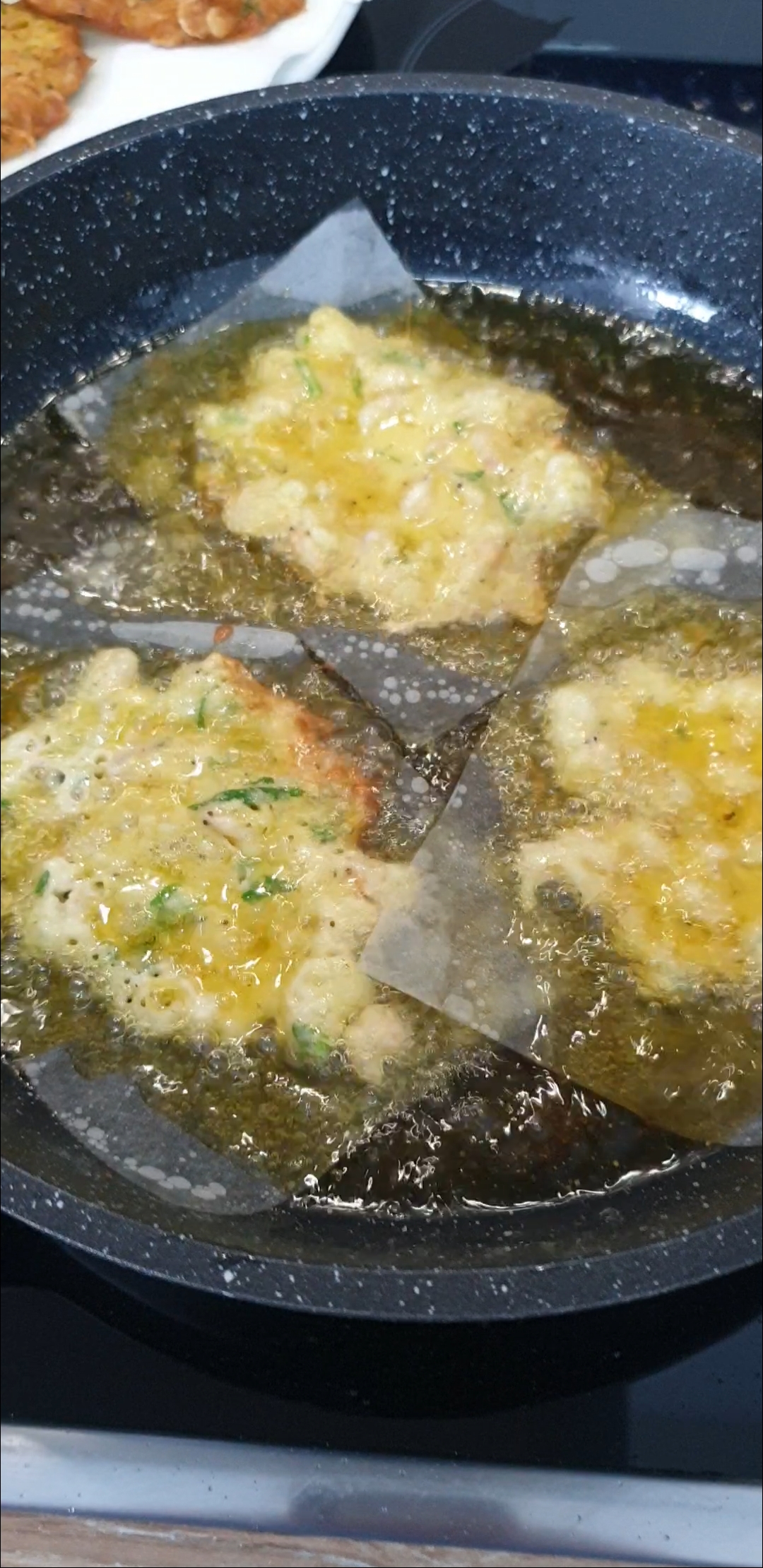 Aquí se están friendo las tortillitas encima del papel de hornear o papel vegetal. Así es más cómodo formarlas . No se ensucia nada y mantienen la forma que le queramos dar.