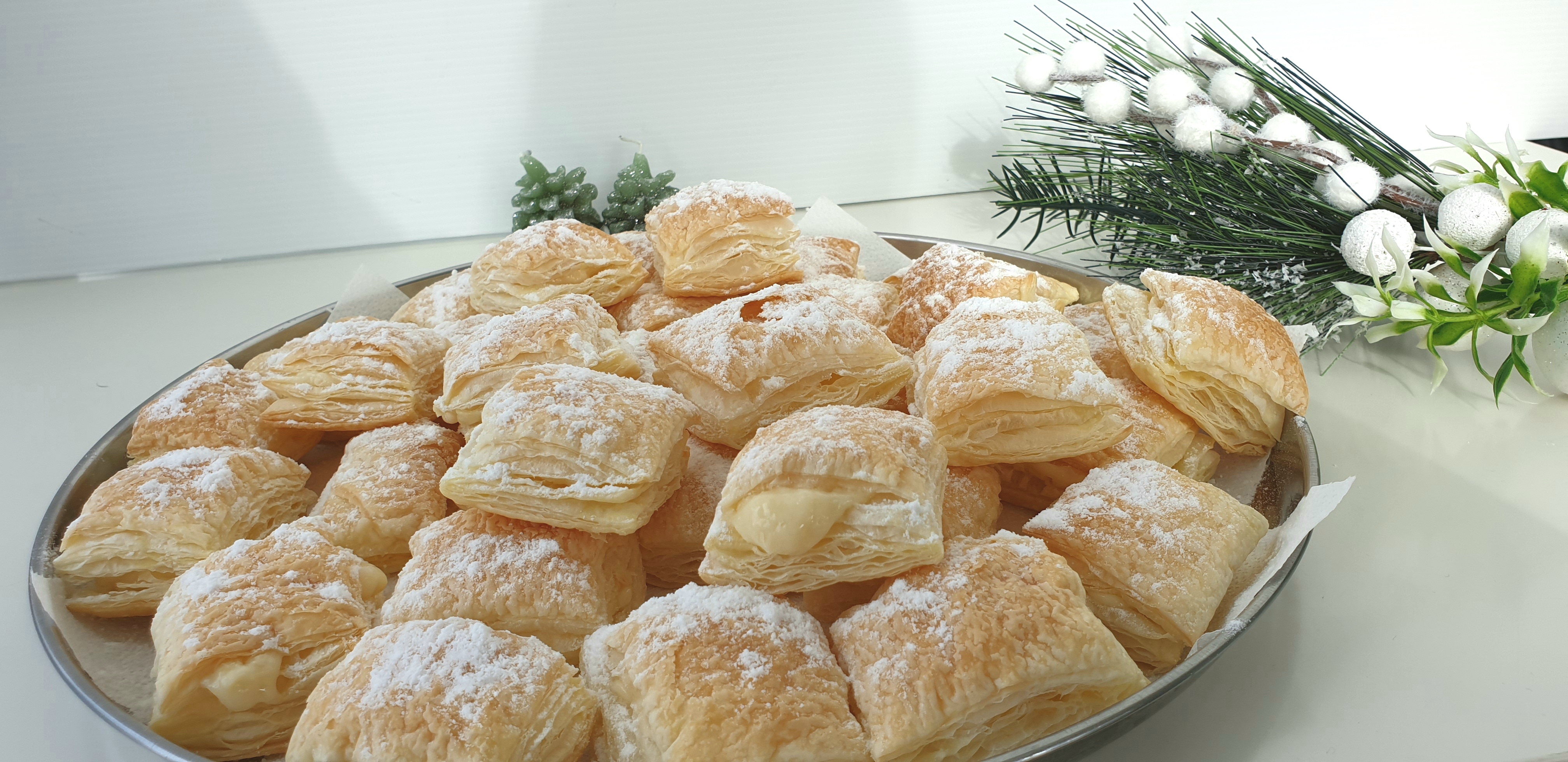 Abra los cuadraditos de hojaldre por la mitad y vaya rellenado con la crema pastelera. Colóquelos sobre una bandeja, espolvoree con el azúcar glas por encima y ...listos!!!!!