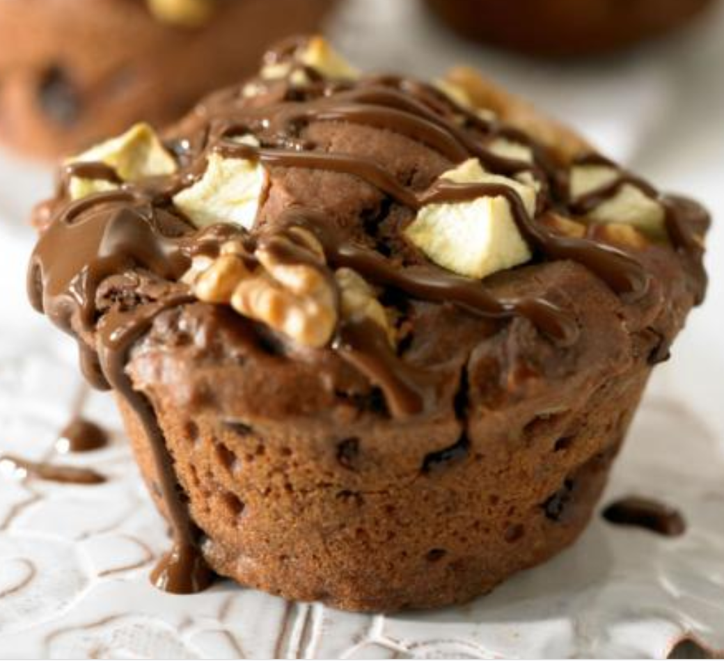 5.Echamos las pepitas de chocolate al vaso y mezclamos con la espátula. Vertemos la masa en una manga pastelera y rellenamos los moldes de muffins. Repartimos los trozos de chocolate por la superfie y horneamos durante 25 minutos.