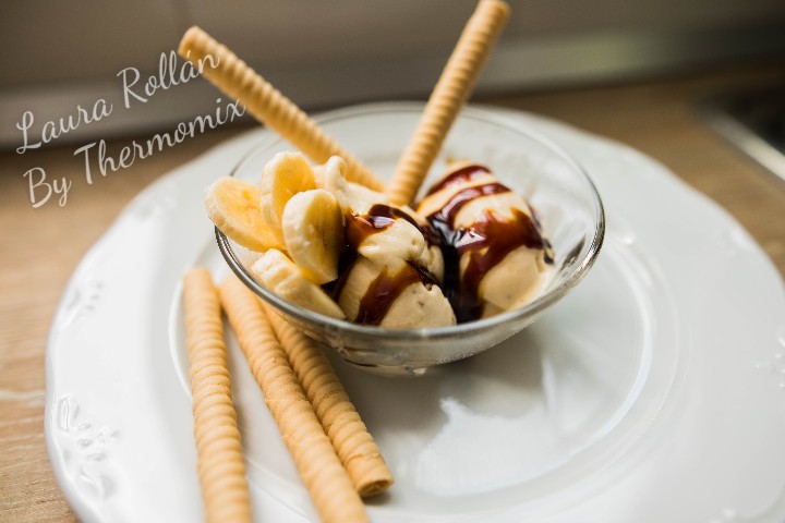 Ponga los plátanos en el vaso y programe 20 seg/vel 8. Baje los restos de las paredes con la espátula y vuelva a progamar otros 20 seg/ vel 8 para cremar.