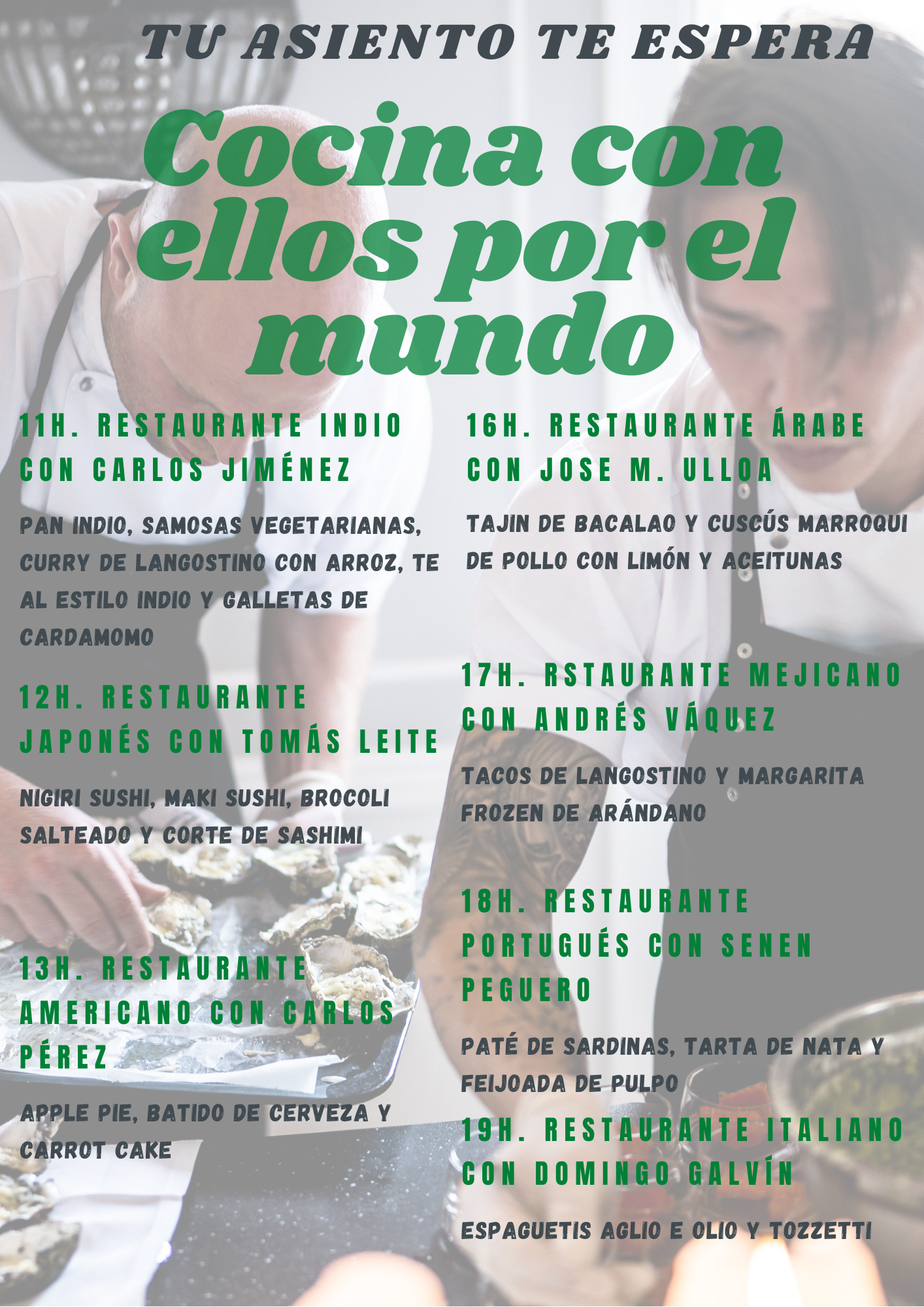 El día 6 de Marzo desde las 11h. de la mañana hasta las 20h. os traemos a nuestros mejores chef, para que disfrutéis de unas jornadas únicas y especiales.