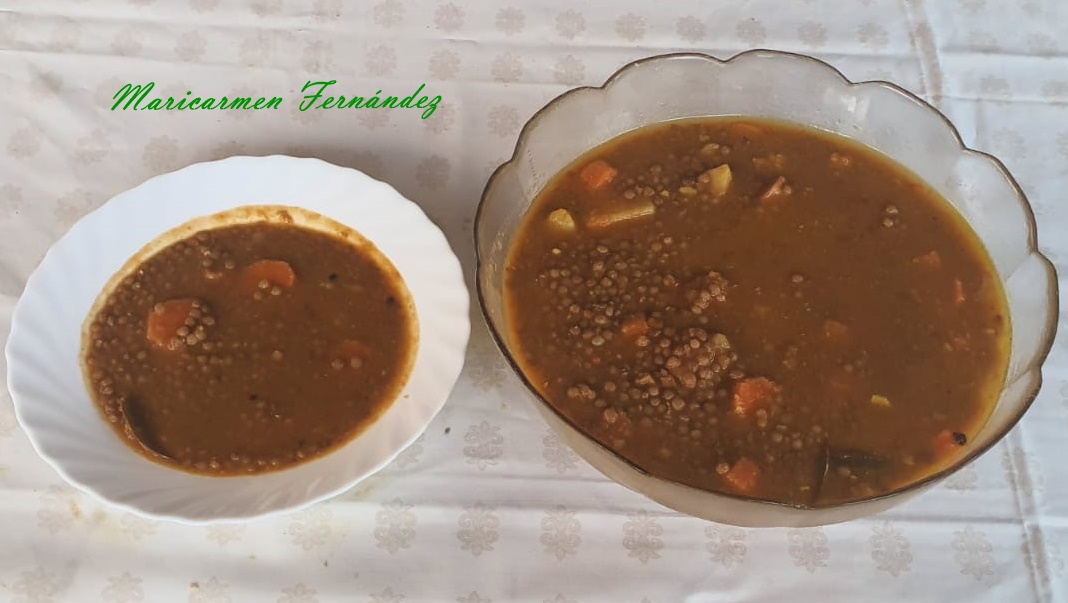 Luego añadir al sofrito las lentejas el agua, la sal, el pimentón, las zanahorias en trozos, la