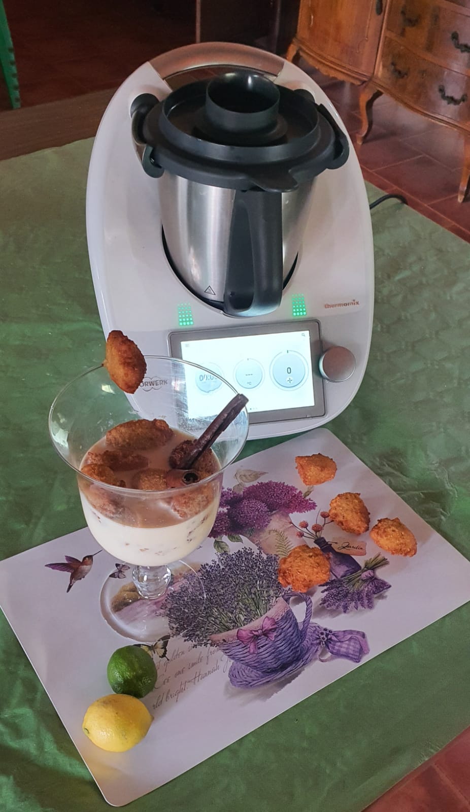 Poner en el vaso los 900 gr de leche, el azúcar, la cáscara de limón, la canela en rama, la canela molida y el anís molido y programamos 20 min, 90º y velocidad cuchara con giro inverso.