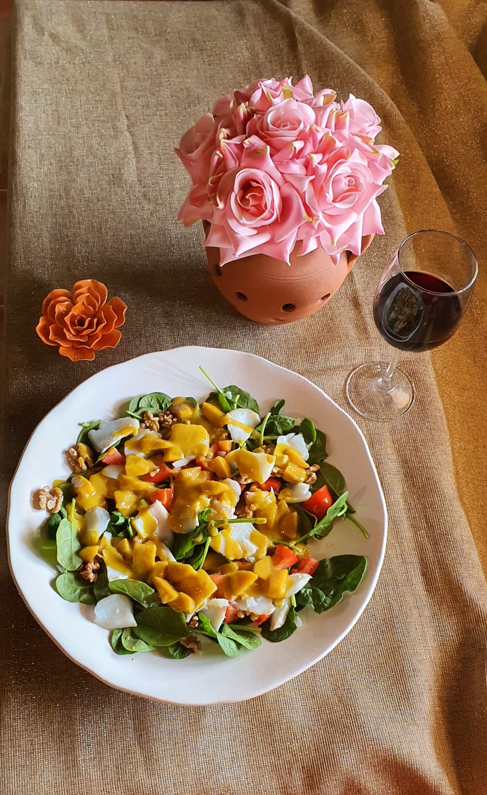 Con ayuda de un cuchillo, corte la otra mitad del mango en bastones y mezcle con la vinagreta. Coloque los brotes de espinaca en una fuente y desmenuce el bacalao por encima. Añada los tomates cherry y las nueces, aliñe con la vinagreta y sirva.