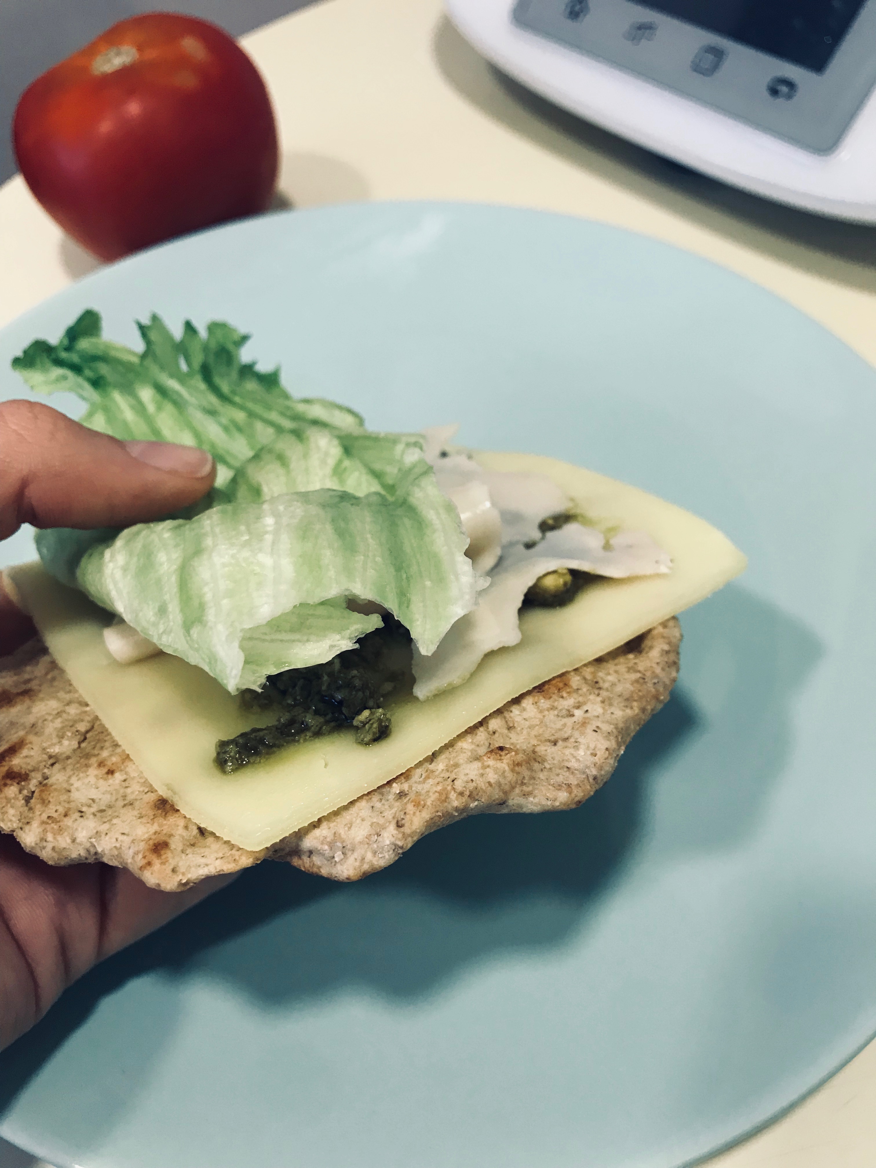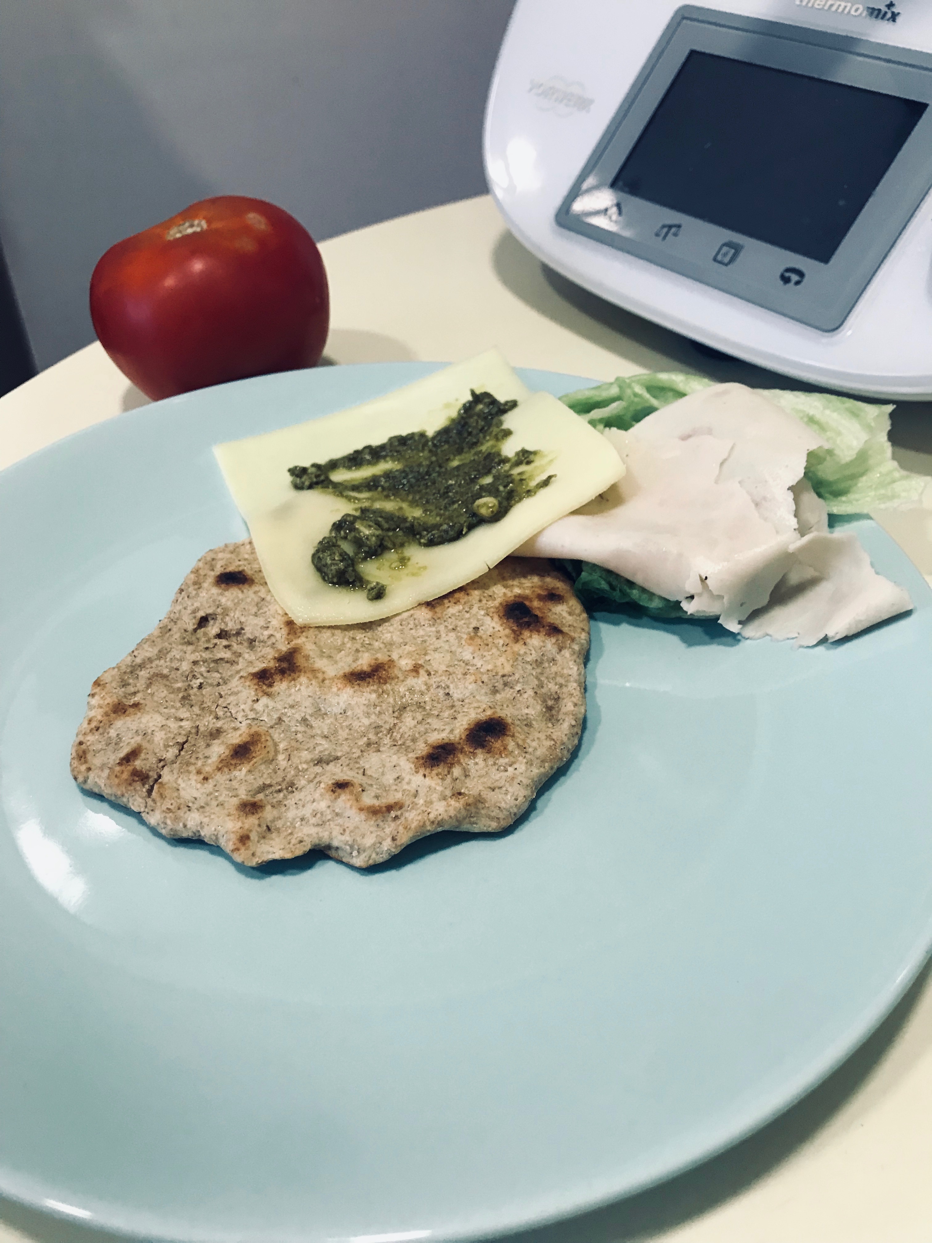 Aquí os adjunto las fotos, yo personalmente le eché pavo, queso, lechuga y salsa pesto, también hecha con Thermomix, obviamente ;)
