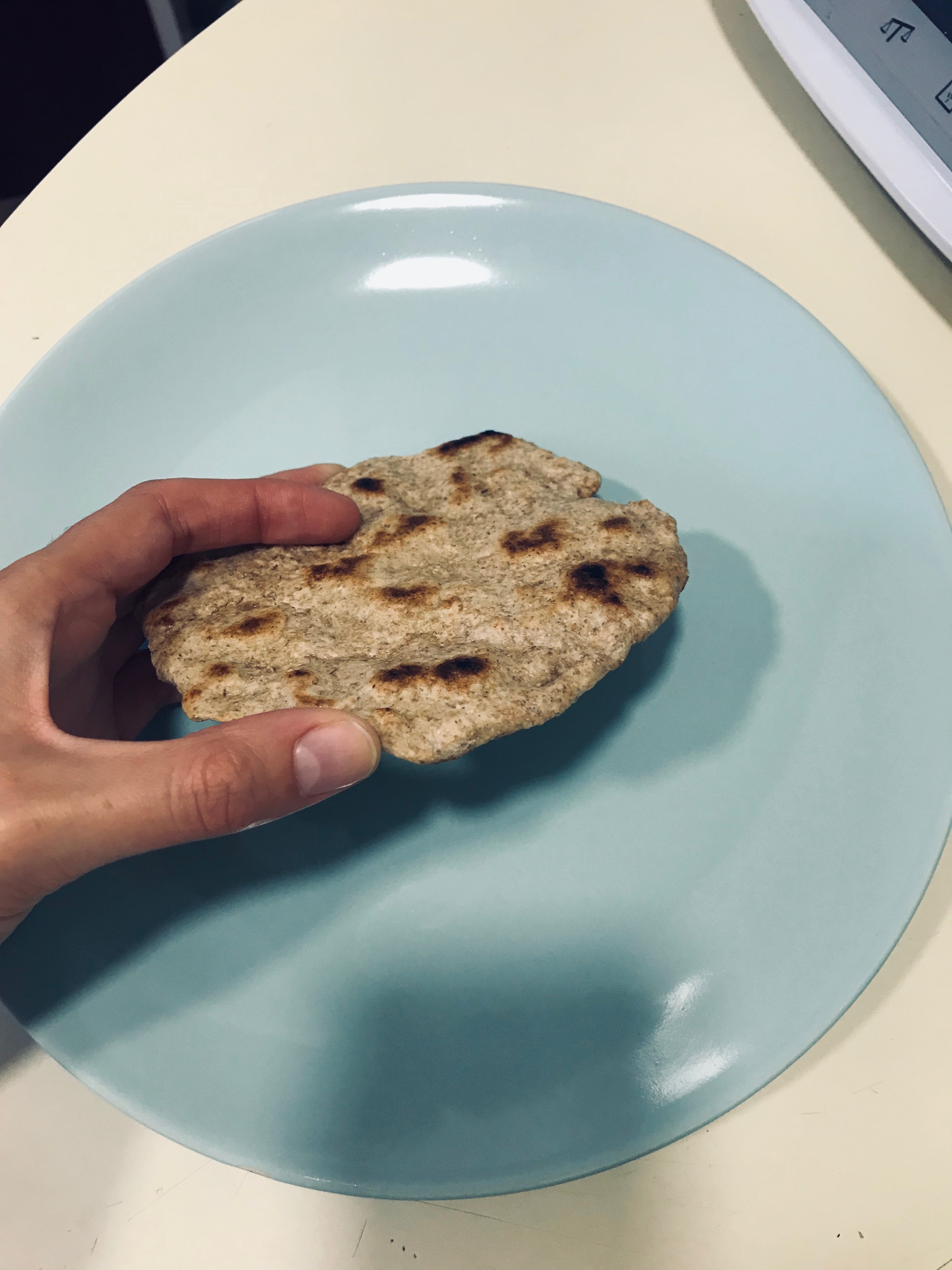 Me paso por aquí con una receta fugaz. De esas que se tardan más en contar que en hacer jajaja. Hoy he llegado a casa con ganas de pan, no se si os he dicho en alguna ocasión, pero soy fiel a mi pan hecho en casa SIEMPRE. Congelo y voy sacando si no voy a consumirlo rápido, pero bien aguanta tres días en un estado bastante óptimo. Me gusta tostarlo en la sartén antes de consumir, debido a que el sabor y textura mejoran, porque además de hacerlo yo, siempre es integral, y a este tipo de panes con harina de grano íntegro, a mi gusto un golpe de calor siempre les sienta estupendamente. El caso es que al llegar a casa no tenía pan hecho, lo he amasado en un plis en la Thermomix. Y aunque como siempre, ha ido al horno después del reposo, he cogido dos bolitas aplastadas de la masa, y han ido directas a la sartén. No podía esperar tanto jajaja. El resultado me ha dejado tan asombrada, y la técnica tan rápida, que he venido directa a dejaros el truco por aquí, porque es un apaño bastante bueno cuando te apetecen unas ricas tostadas y la paciencia no es lo tuyo.