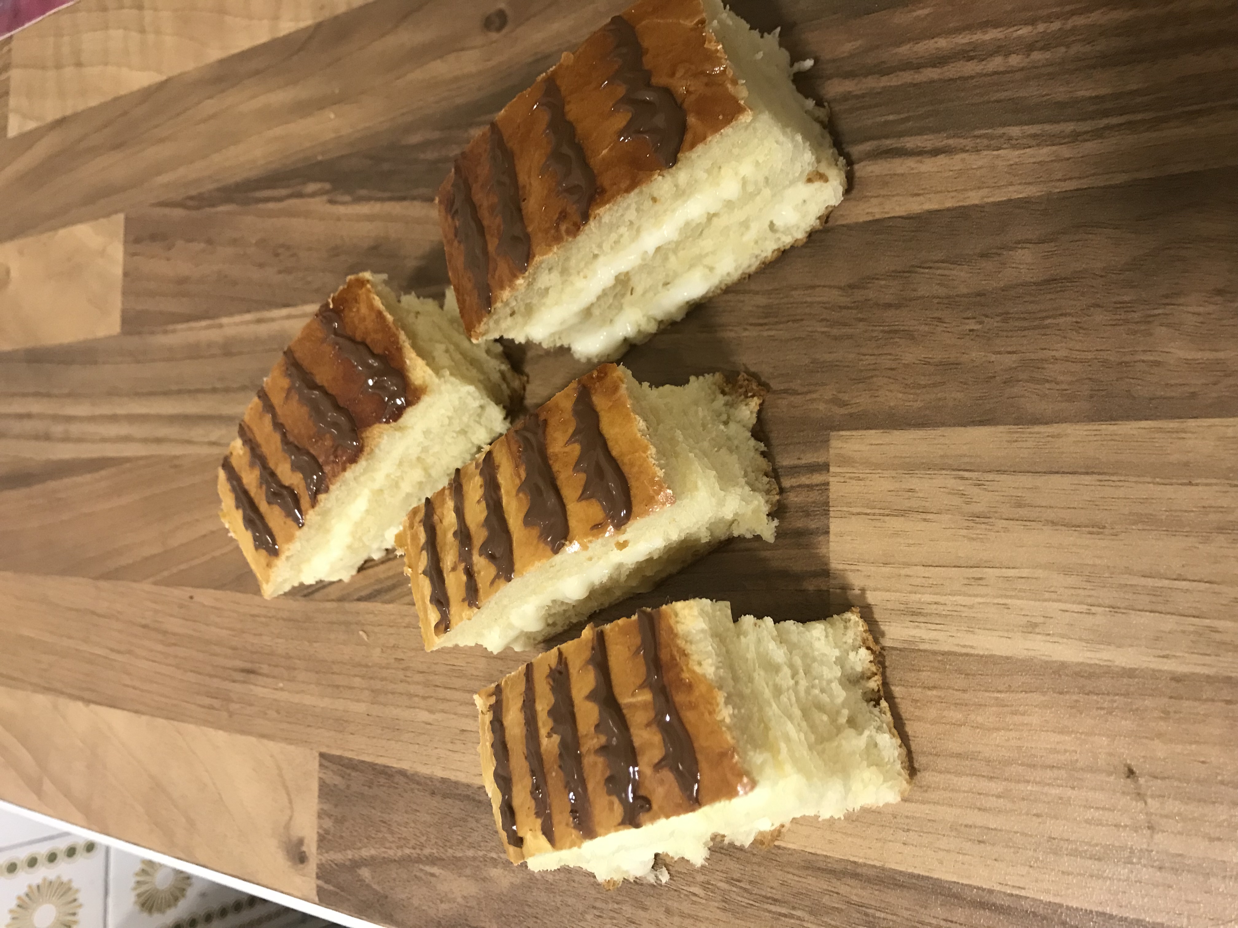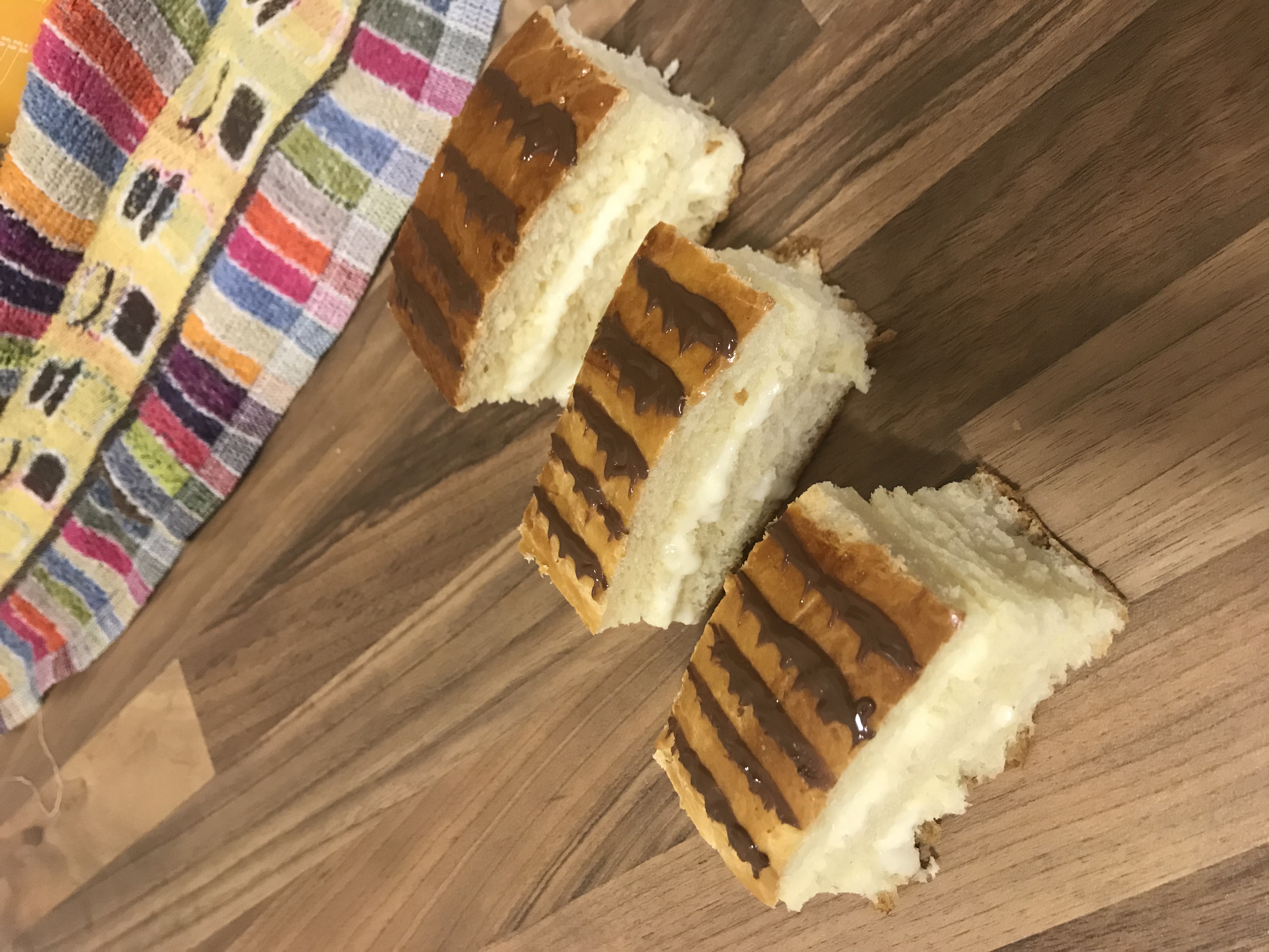 - Cuando nuestra masa esté fría, retiramos los bordes de la misma (optativo para un mejor resultado estético) y partimos nuestros brioches. Yo con mi molde corté una de largo quedándome de unos 7 cm cada uno y de ancho de unos 3 o 4, pero esta medida la podéis adaptar a la medida de la masa. Queremos rellenar cada uno con dos capas de crema, así que los abrimos en tres partes modo sandwich.