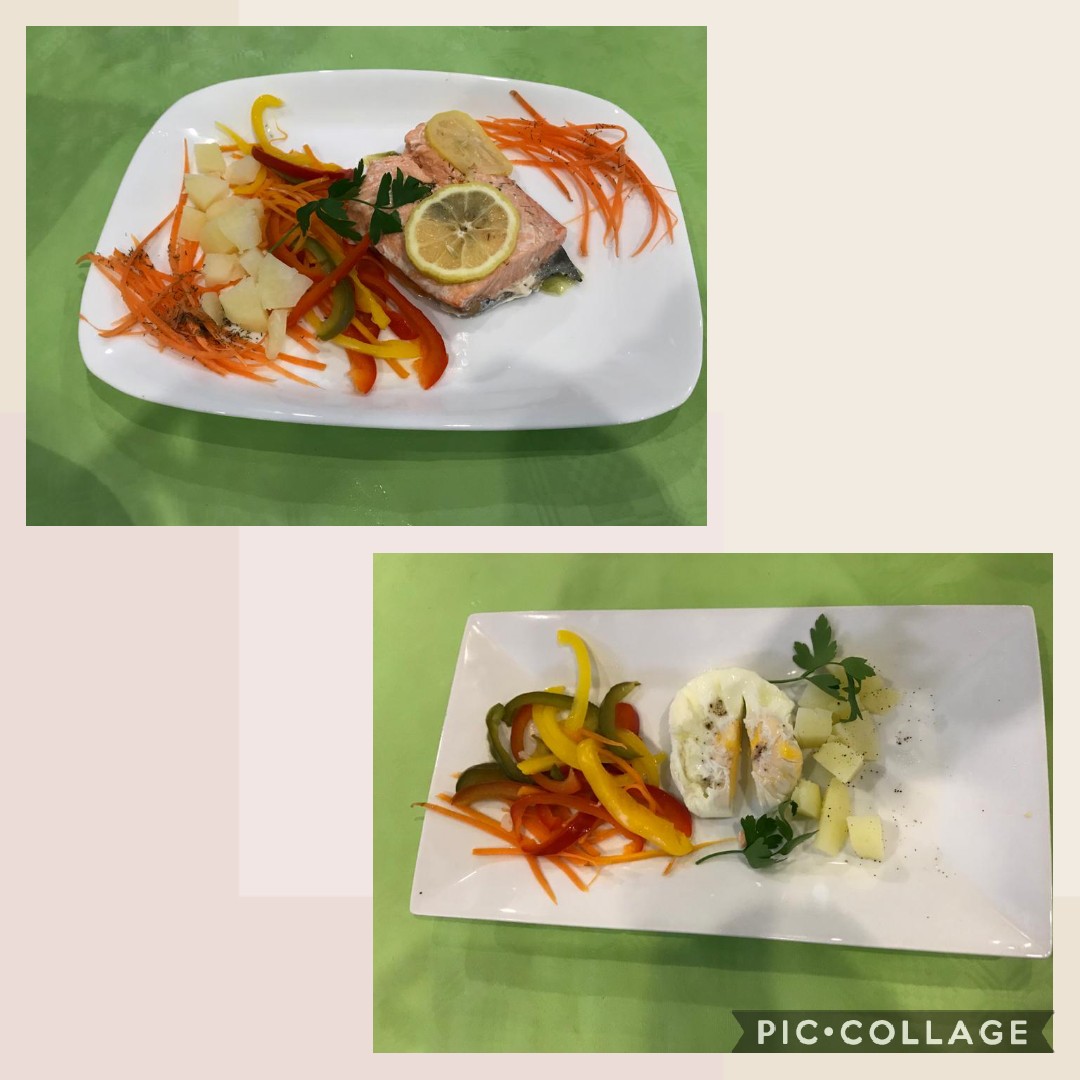 - Vierta el agua en el vaso. Introduzca el cestillo con las patatas. Sitúe el recipiente Varoma en su posición y coloque dentro la zanahoria, el pimiento y el brócoli. Coloque la bandeja Varoma y cúbrala con las hojas de lechuga teniendo cuidado de no tapar todas las ranuras para permitir la circulación del vapor. Riegue la lechuga con la mitad del aceite, espolvoree con sal y pimienta y coloque encima el salmón. Rocíe el salmón con el aceite restante, espolvoree con sal y pimienta y adorne con las rodajas de limón y el eneldo. Coge el cubilete ,le pones por dentro film transparente y cascas el huevo,pones aceite, pimienta y sal y lo cierras bien y lo pones junto al salmón. Tape el Varoma y programe 25 min/Varoma/vel 2.
