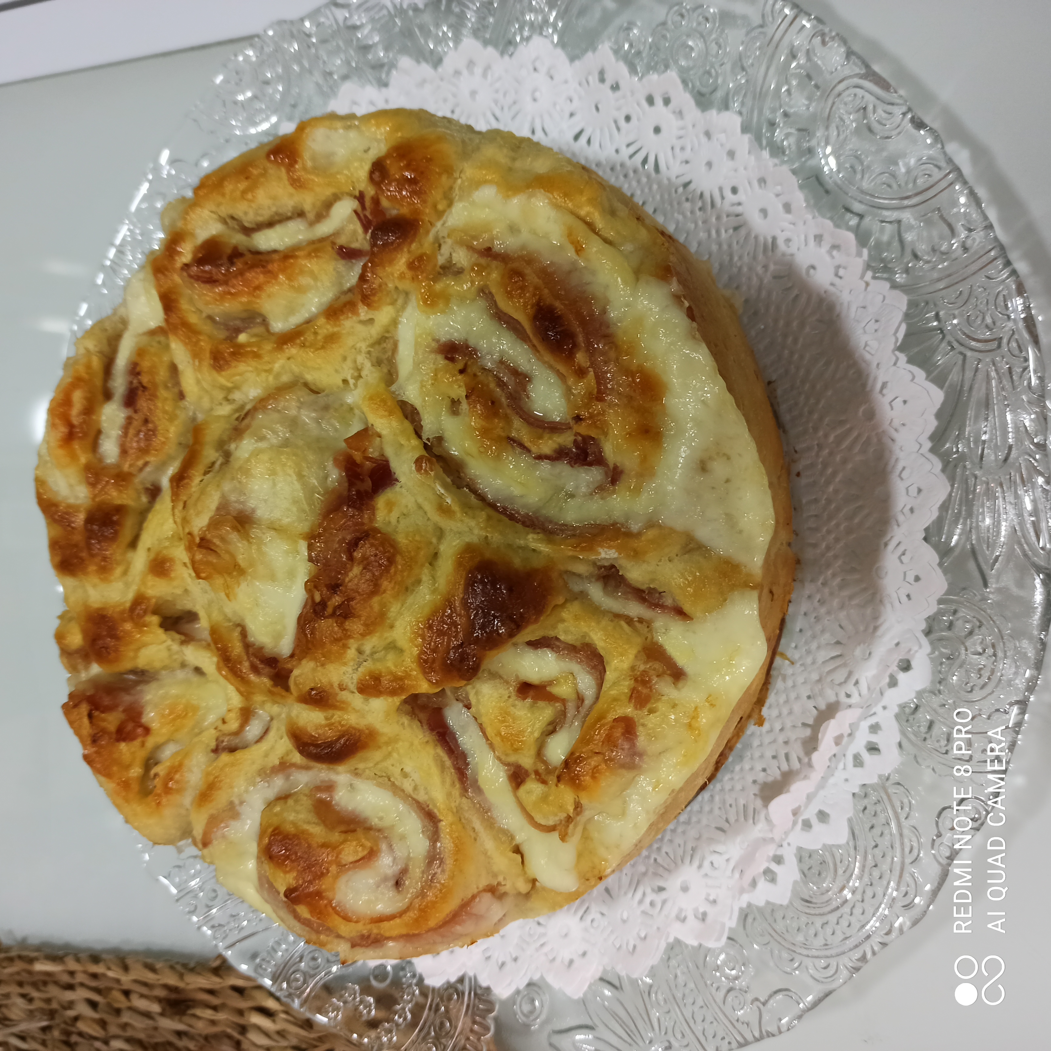 Delicioso rollo en forma de flor, relleno de jamón serrano y queso.