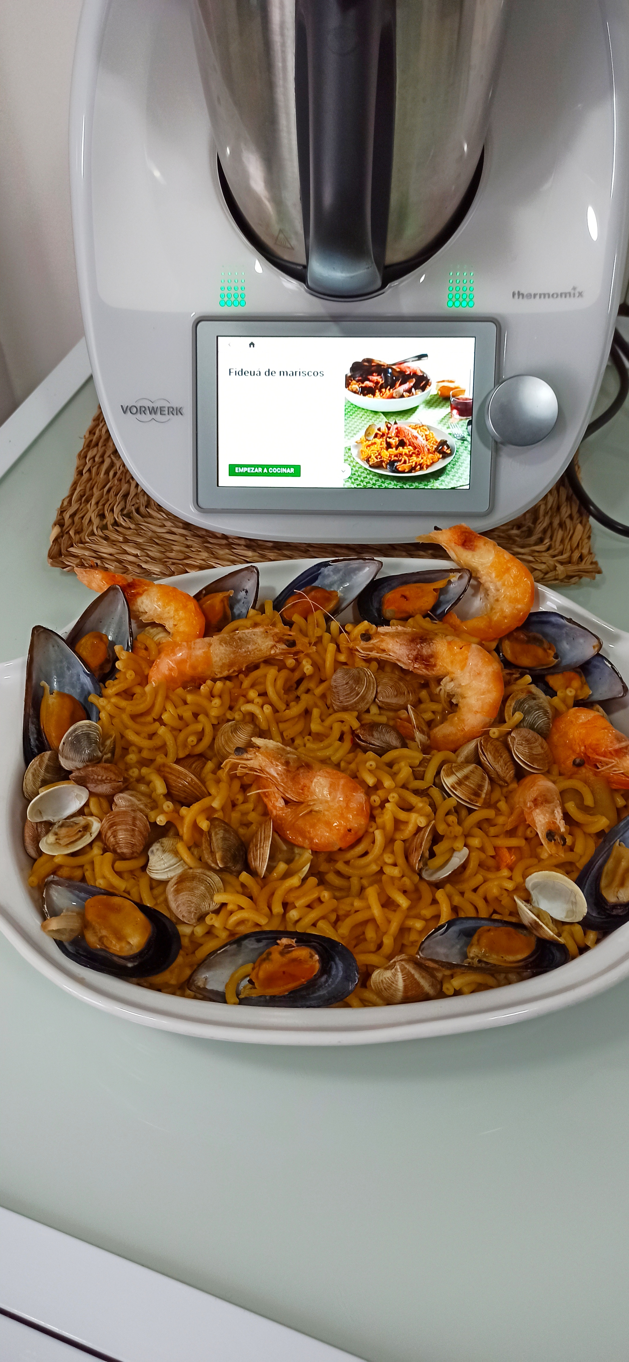 Añada al vaso los fideos y programe 7 min/100°C//vel . Vierta el contenido del vaso en una fuente y coloque encima los mejillones, las almejas y los gambones. Deje reposar unos minutos y sirva.