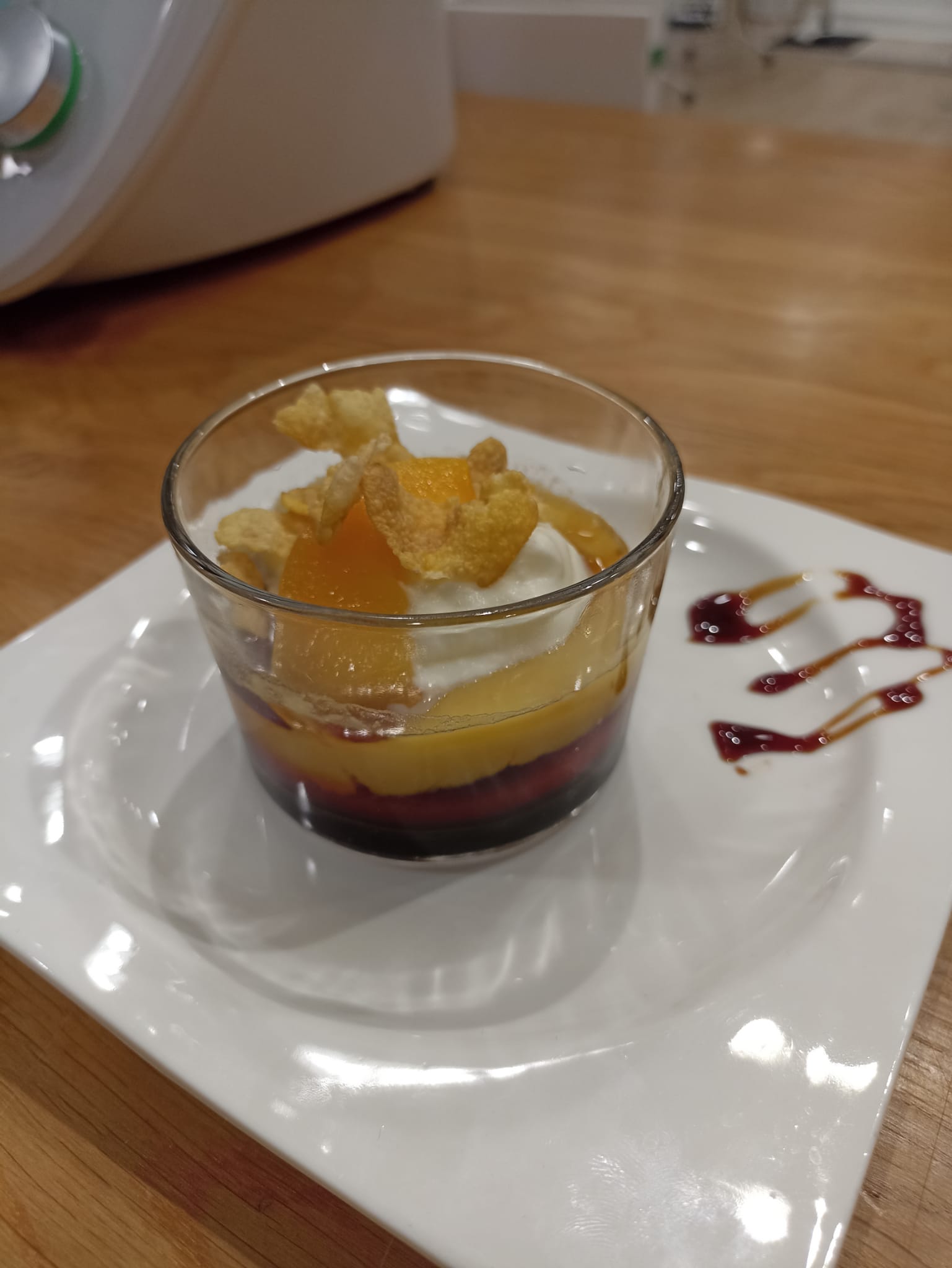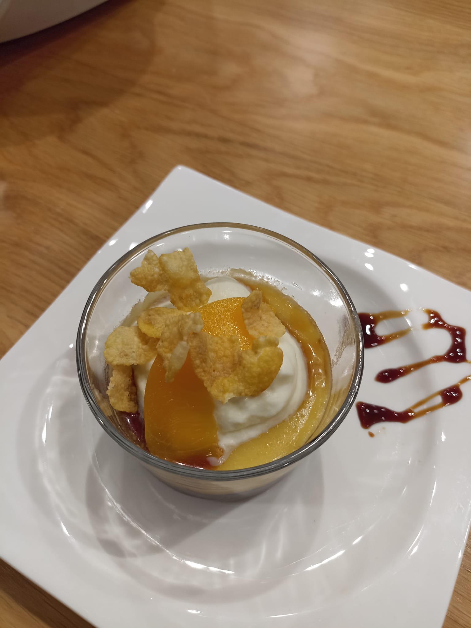 Decore cada vasito con una cucharada de nata montada, un chorrito de caramelo, una lámina de melocotón y unos copos de maíz. Sirva muy fríos.