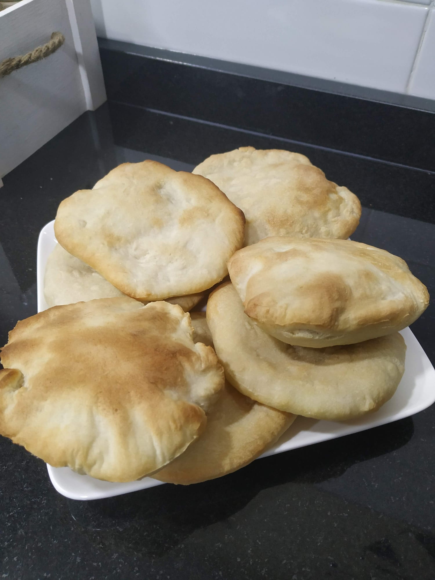 Ponga 2-4 círculos de masa sobre la bandeja de horno precalentada y hornee durante 3-4 minutos (250°C), hasta que se hinchen o estén ligeramente dorados. Ponga los panes pita en un plato y cúbralos inmediatamente con un paño de cocina para que no se endurezcan. Hornee los círculos de masa restantes.
