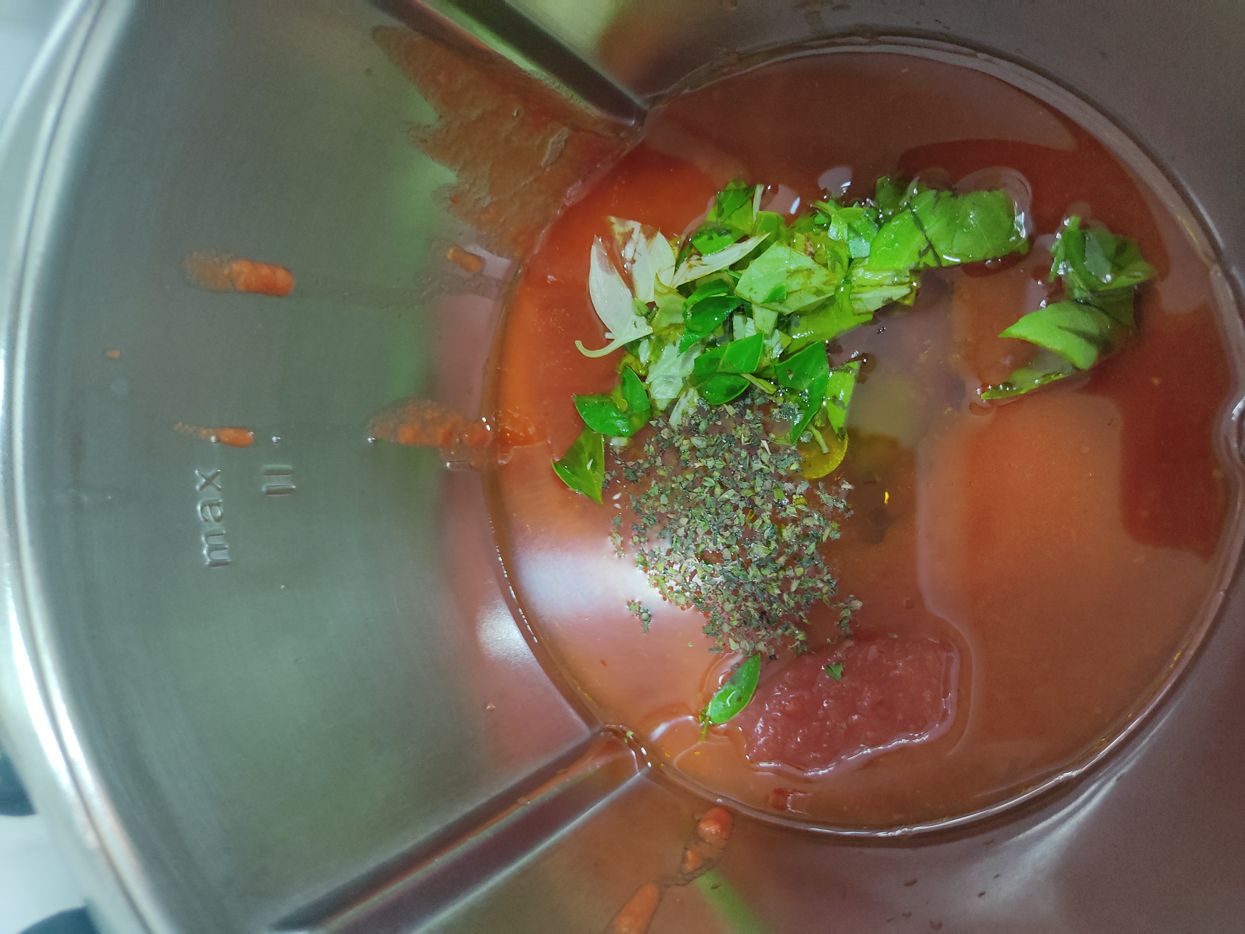 Ponga el tomate en el vaso y triture 5 seg/vel 5. Con la espátula, baje el tomate hacia el fondo del vaso.