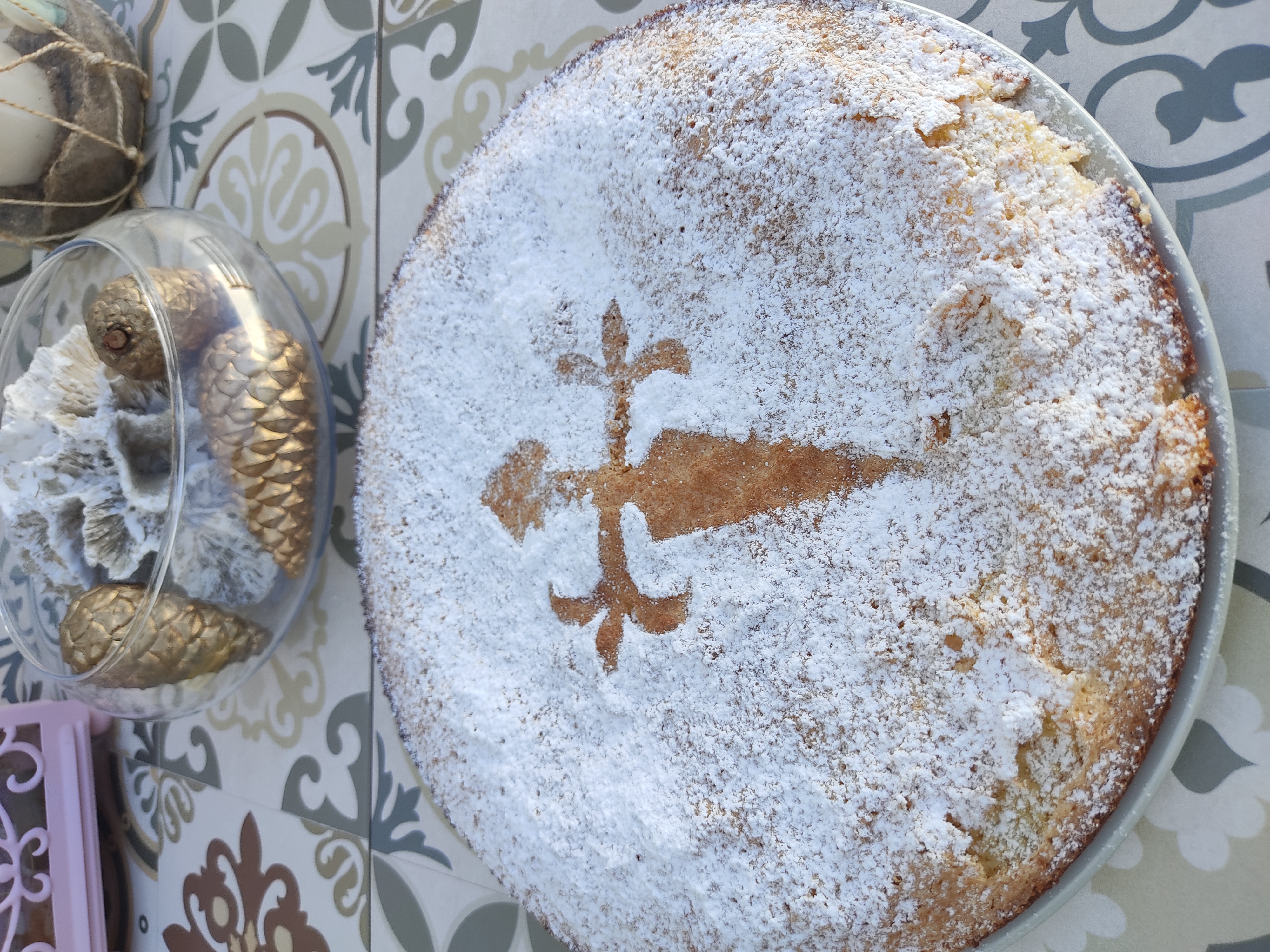 Hornee durante 20 minutos (180°C). Deje enfriar (aprox. 40 minutos) y desmolde. Decore la tarta poniendo la silueta de una cruz de Santiago en el centro y espolvoree toda la superficie con el azúcar glas. Corte en porciones y sirva.