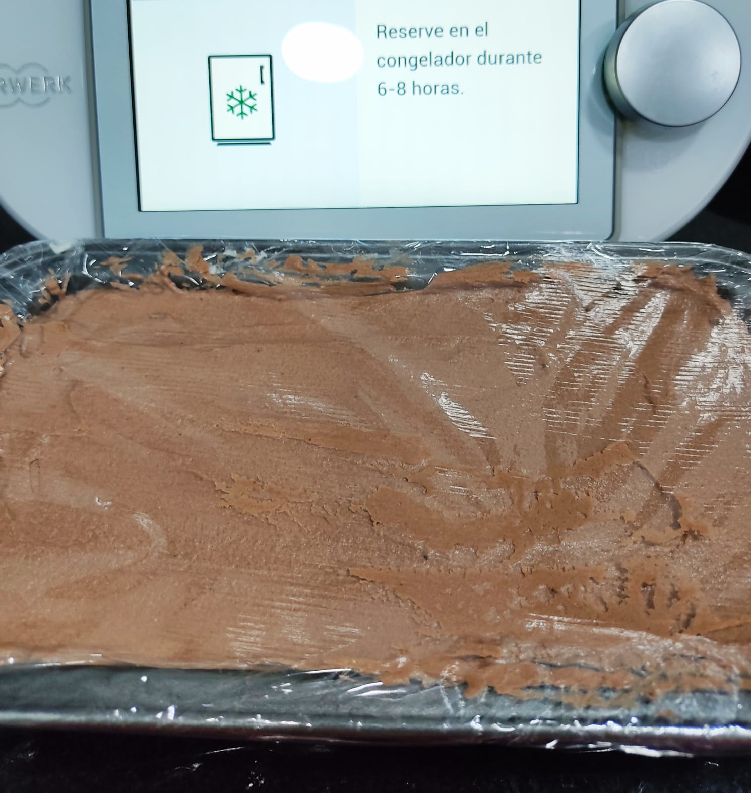 Ponga en el vaso 160 g de leche condensada y el cacao y mezcle 30 seg/vel 3. Vierta sobre la otra mitad de nata montada y mezcle con la espátula hasta obtener una mezcla homogénea. Vierta la mezcla en el molde sobre el praliné, nivele y cubra con film transparente. Reserve en el congelador durante 6-8 horas.