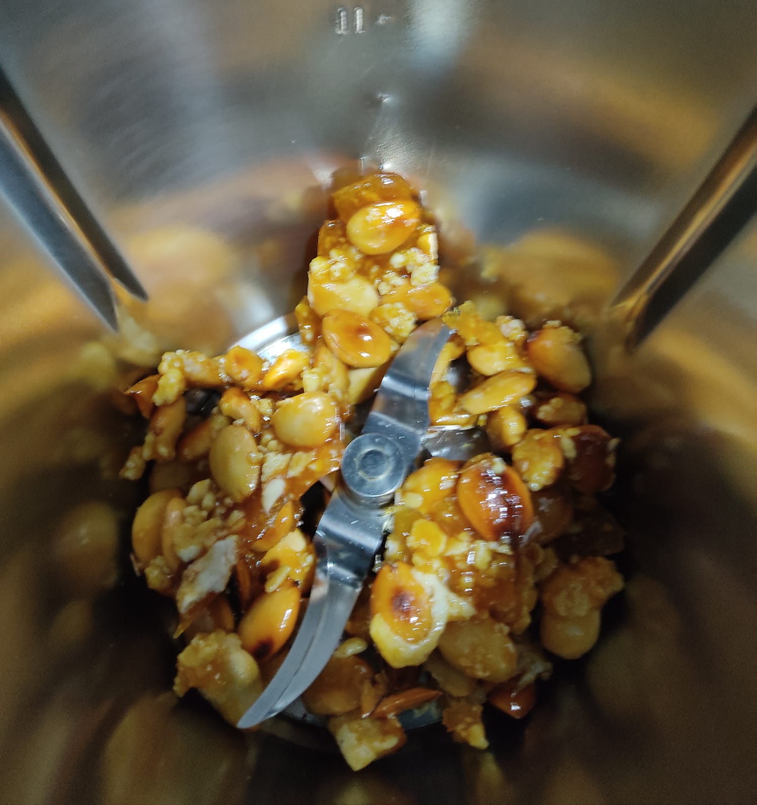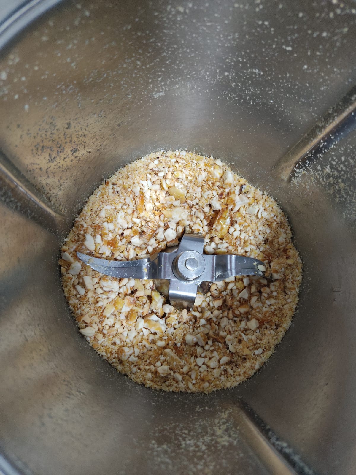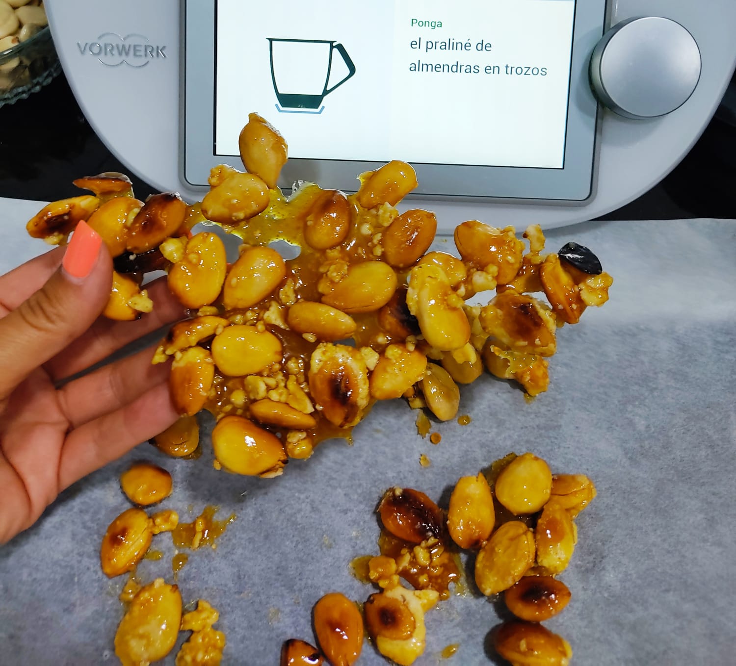 Ponga en el vaso el praliné de almendras en trozos y trocee 5 seg/vel 5. Retire y reserve.
