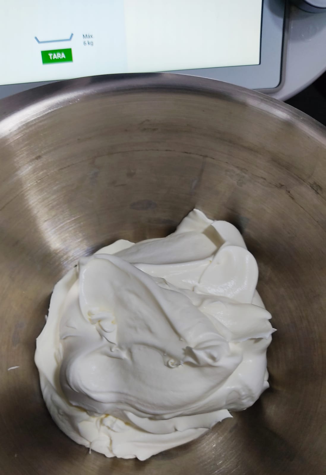 Coloque la mariposa en las cuchillas. Ponga en el vaso la nata y monte a vel 3.5 sin programar tiempo, hasta que esté montada pero cremosa. Retire la mariposa y ponga la nata montada en 2 boles grandes poniendo la mitad en cada uno. Reserve.