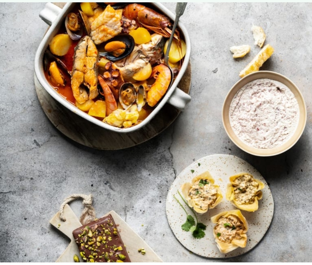 Rellene las tartaletas con el marisco reservado y colóquelas en un plato. Sirva el dip y las tartaletas como entrantes, la zarzuela como plato principal y el turrón de chocolate de postre.
