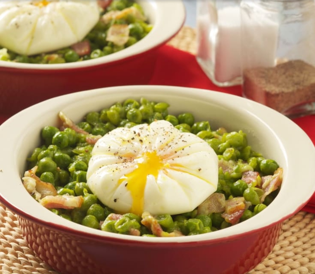 Vierta los guisantes en 4 cazuelas de barro o cerámica. Quite el film de los huevos y coloque sobre los guisantes, espolvoree con sal y pimienta y sirva inmediatamente.