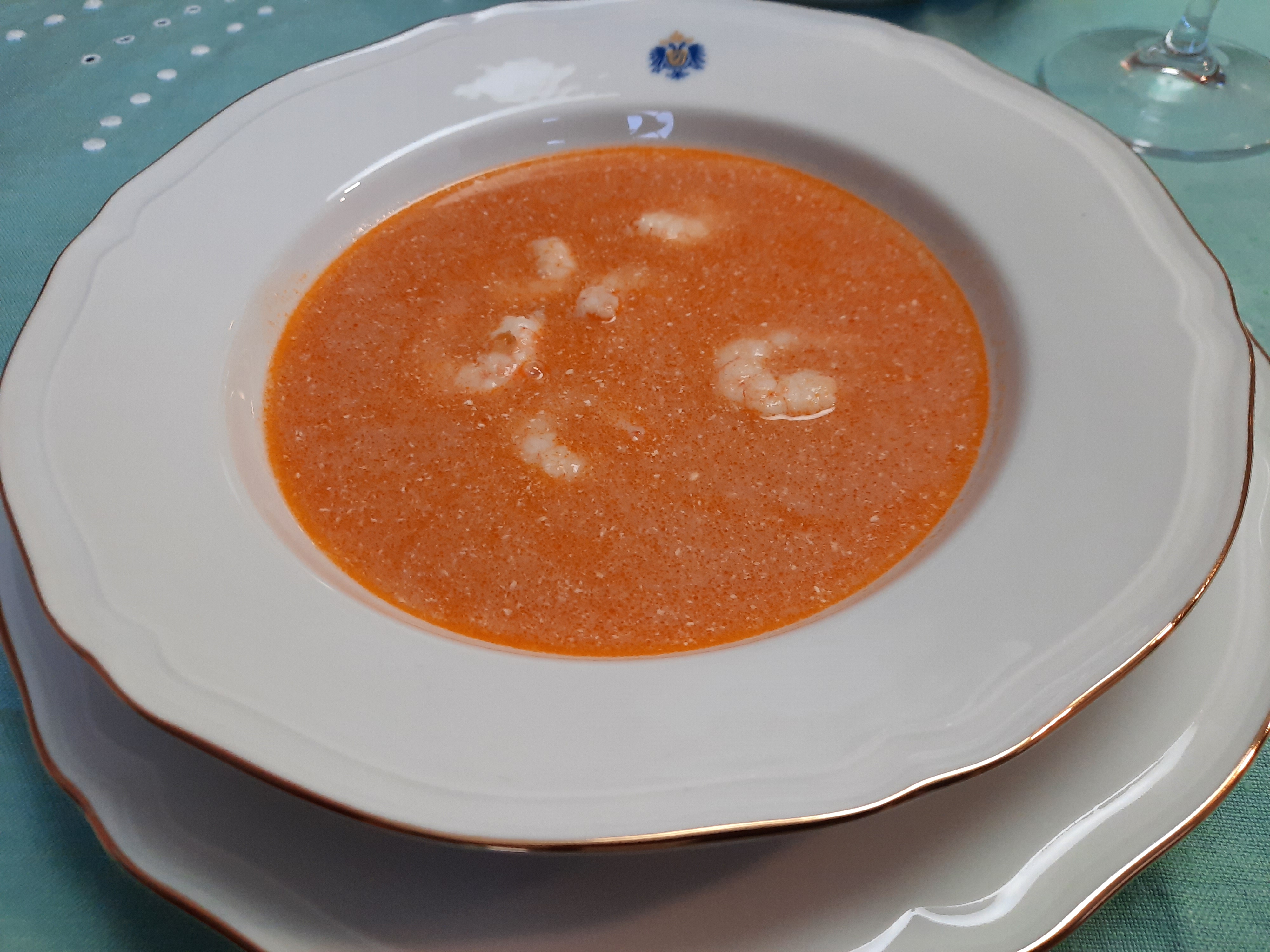 Pasar la sopa por un colsdor fino y así retiramos las pequeñas partículas de cascaras. Añadimos sal y pimienta al gusto, el coñac y las gambas peladas. En la sopera añadimos la nata liquida y vertemos lentamente sobre la nata, para que no se corte la crema.